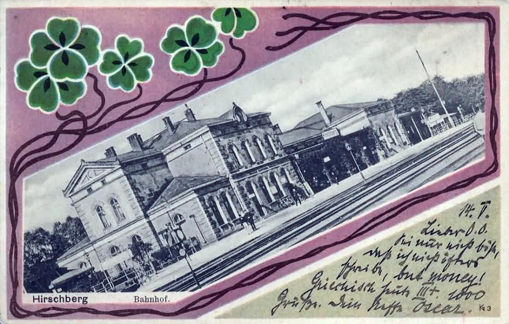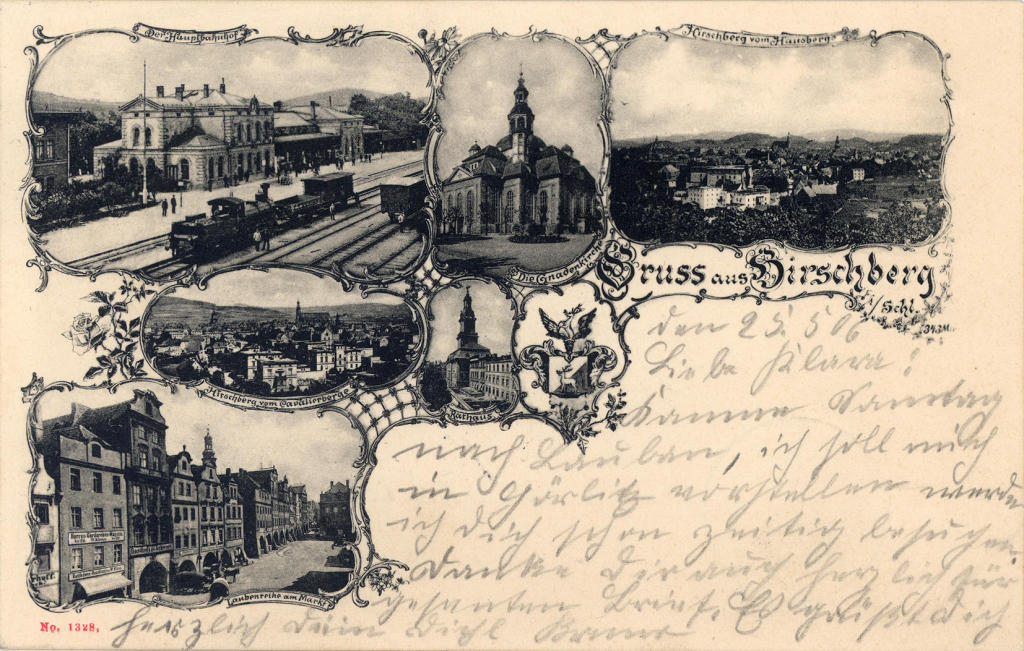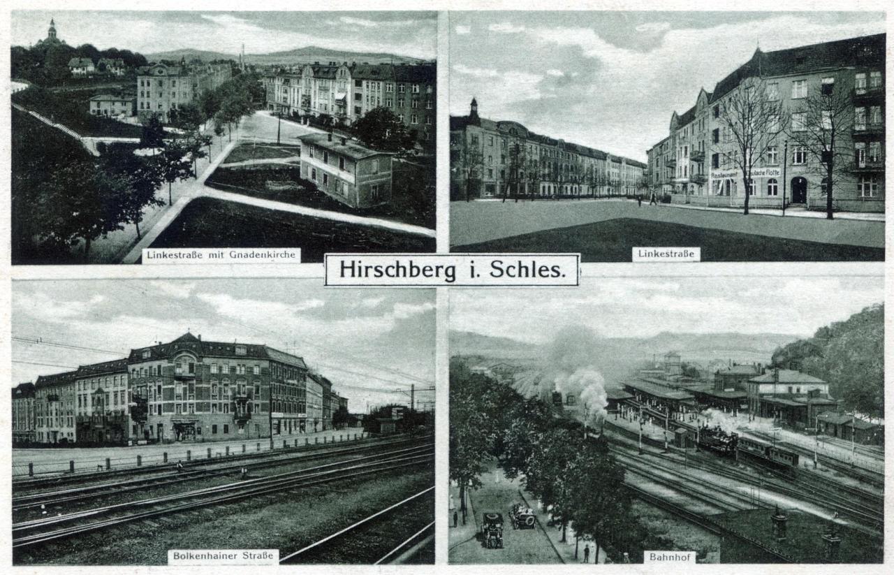Pocztówka z Jeleniej Góry. Stacja jest na dolnych obrazkach.