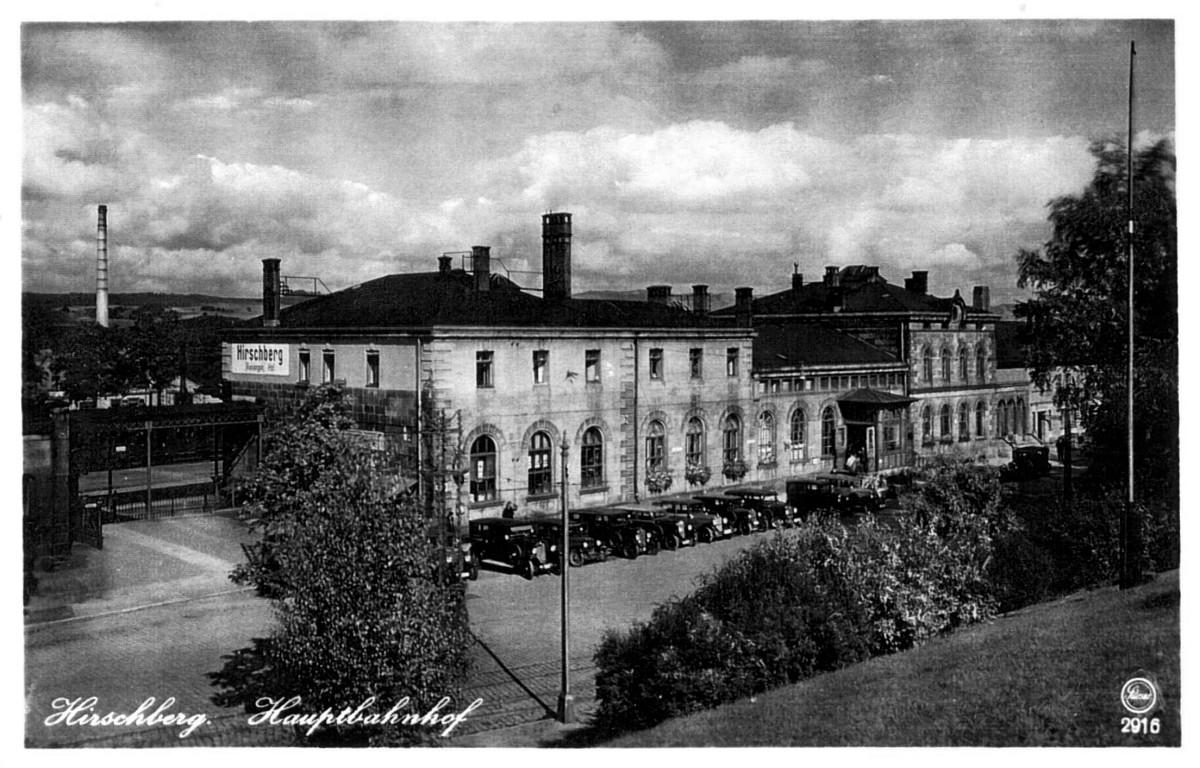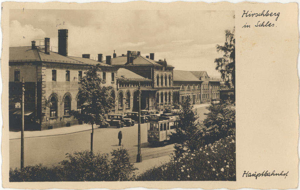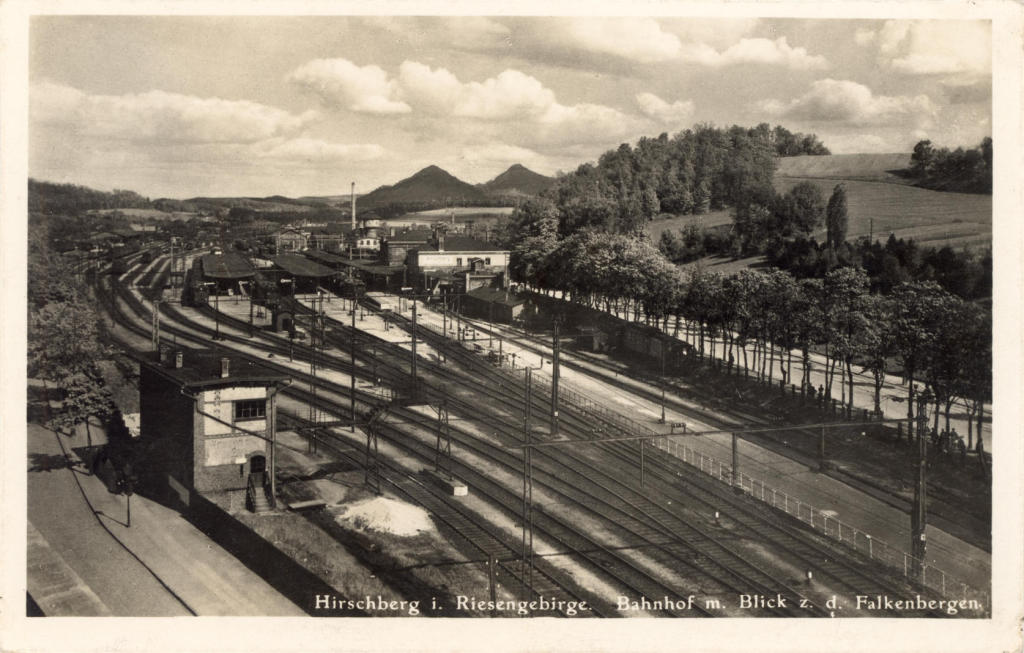 Zachodnia głowica stacyjna. Z lewej strony obecna ul. Wincentego Pola i nastawnia wykonawcza. W tle perony dworzec. Widok w kierunku wschodnim, od strony wjazdów ze Szklarskiej Poręby, Gryfowa Śląskiego/Zgorzelca i Lwówka Śląskiego. Ze zbiorów Adama Pacześniaka.