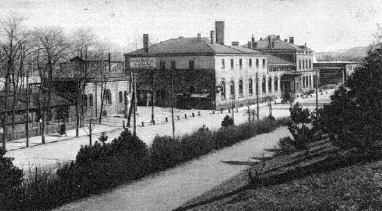 Budynek dworca od strony miasta (dzisiejsza ul. 1 maja). Na dole widoczne torowisko tramwajowe. Widok w kierunku północno-wschodnim.