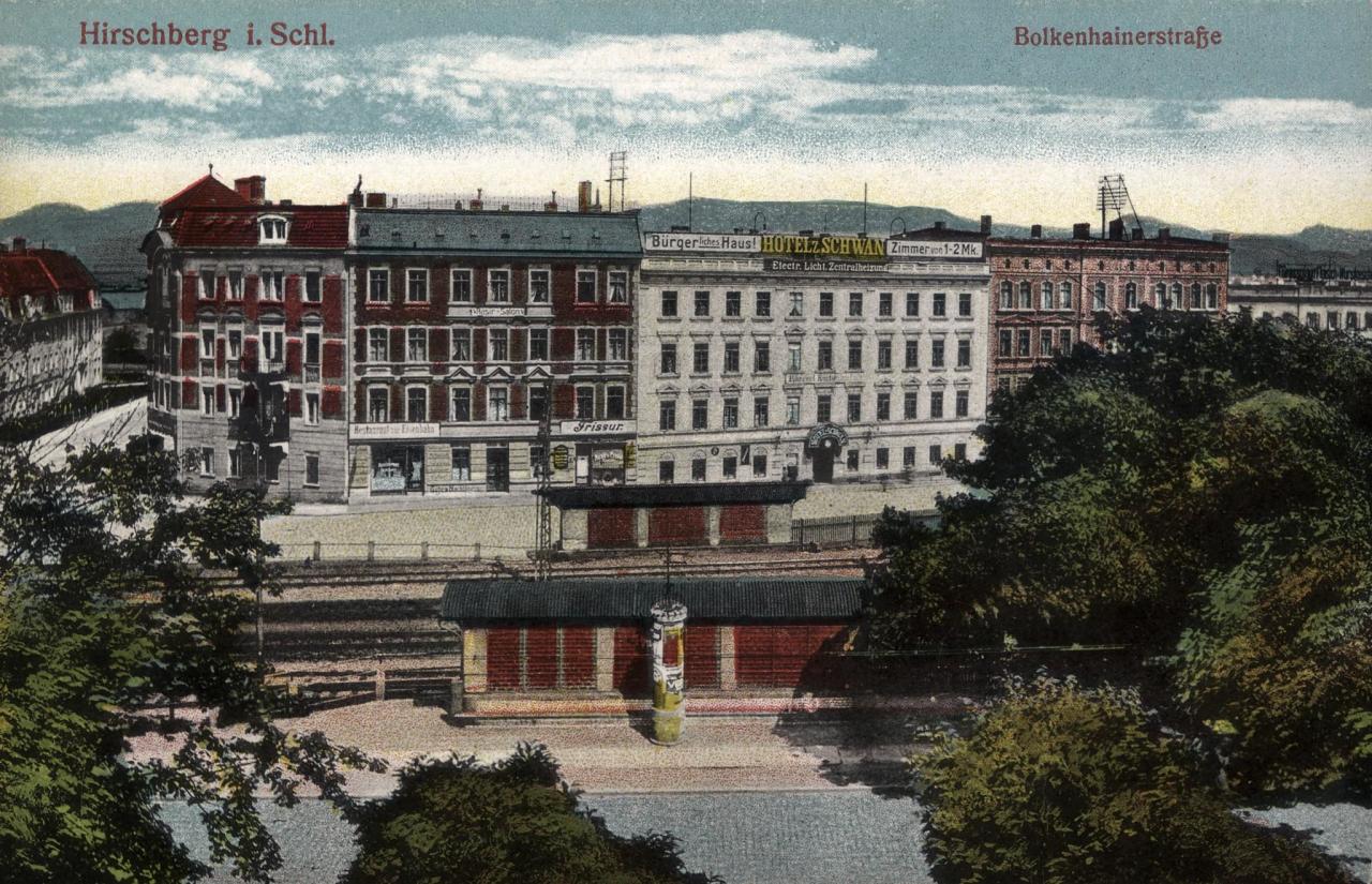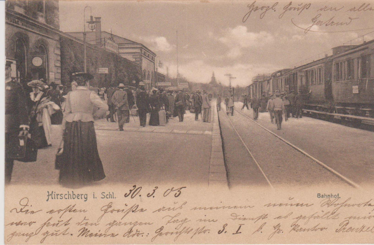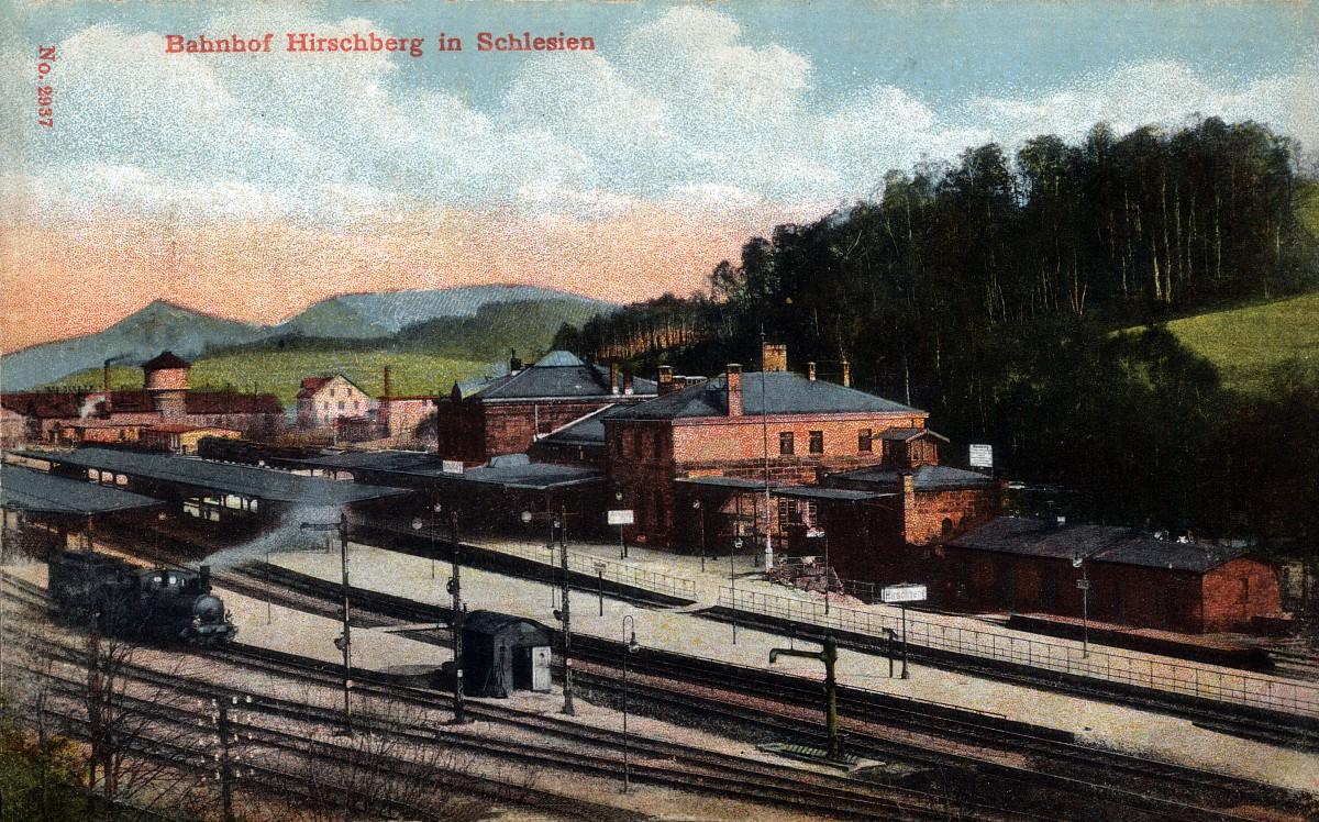 Budynek dworca od strony peronów. Widok w kierunku zachodnim, od strony wjazdów z Marciszowa/Wrocławia i Mysłakowic (dalej Kamienna Góra i Karpacz). Stara pocztówka.