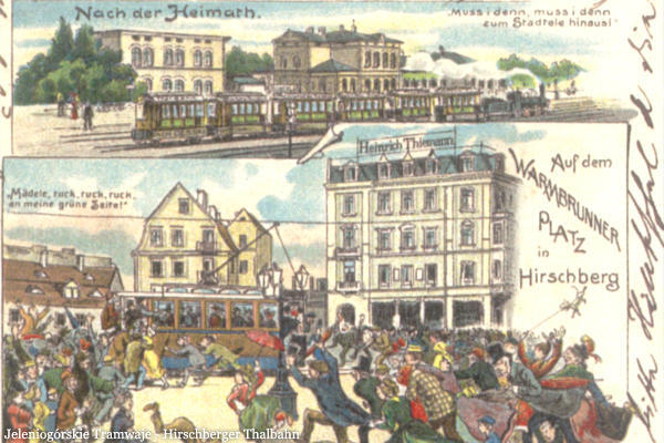 W górnej części kartki widok na dworzec, a w dolnej tramwaj na obecnym pl. Niepodległości.