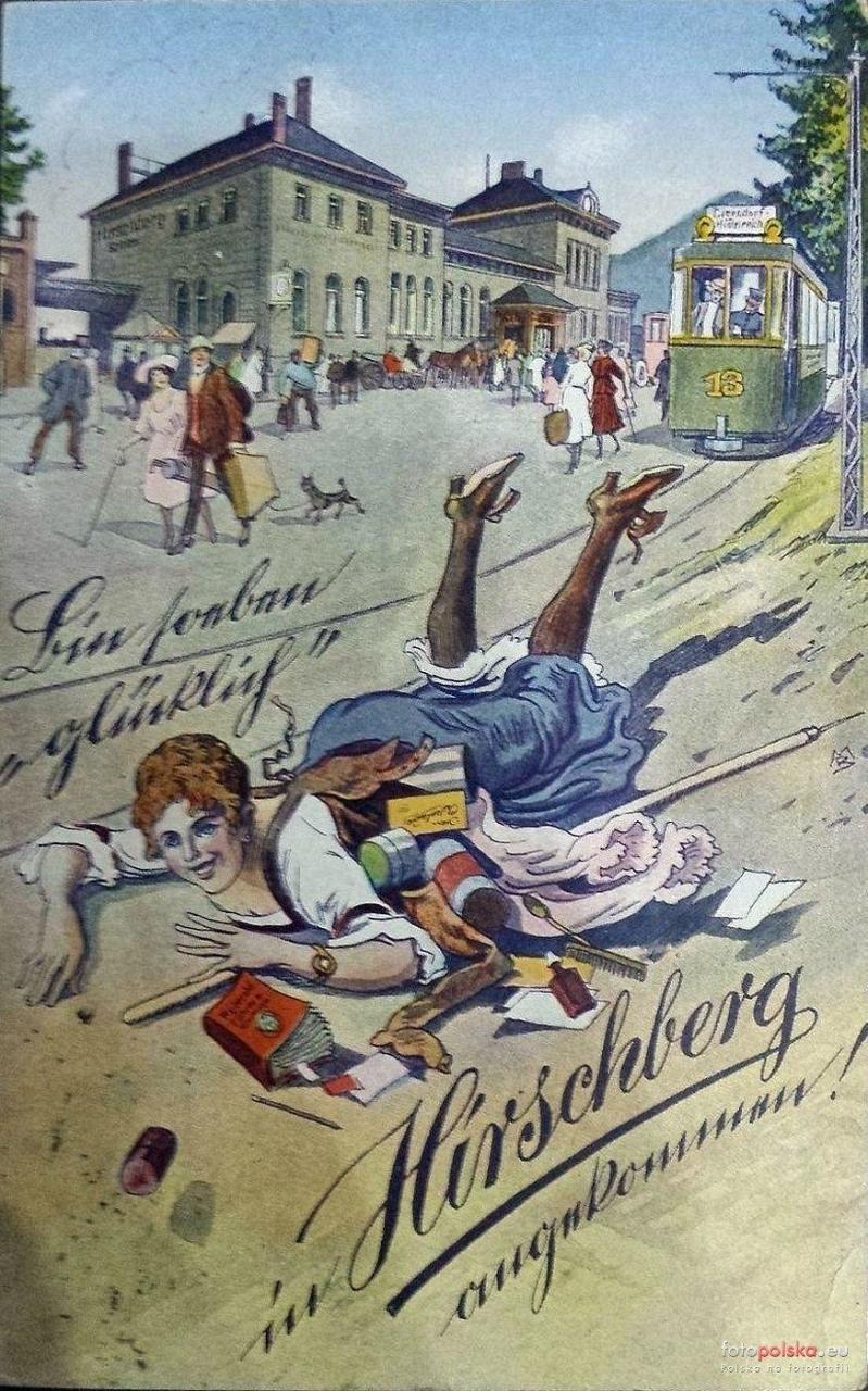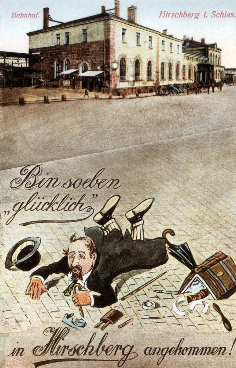 Budynek dworca od strony miasta (dzisiejsza ul. 1 maja). Widoczne torowisko i tramwaj. Humorystyczna pocztówka. Widok w kierunku wschodnim.