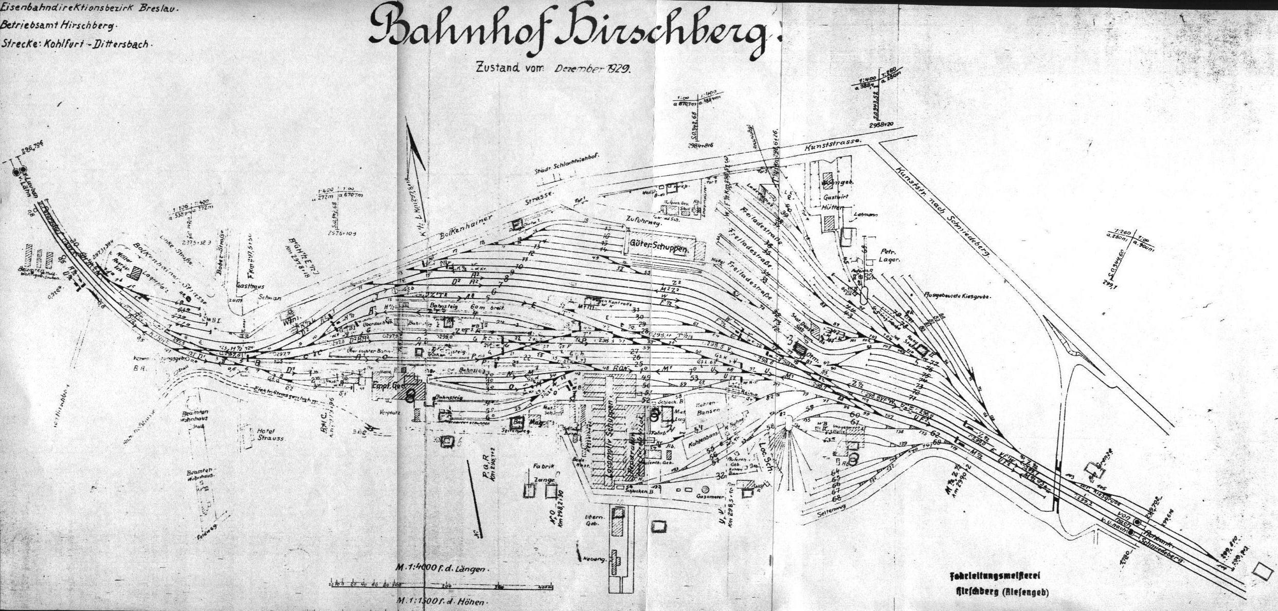 E 21 01 im Bw Hirschberg, 1933 (Kallmünzer, Sammlung Scheingraber). Wschodnia głowica stacji. Z prawej strony kadru nastawnia wykonawcza JGM1. Widok w kierunku północno-wschodnim; w prawo Mysłakowice, Marciszów.