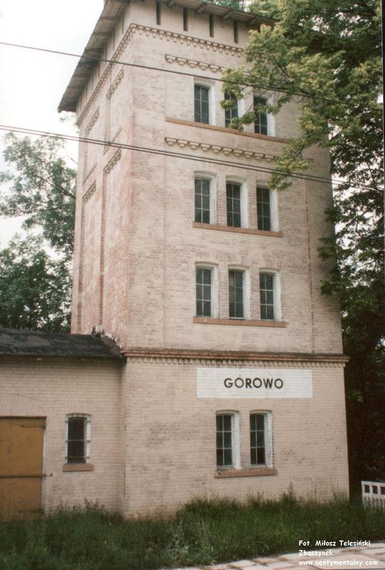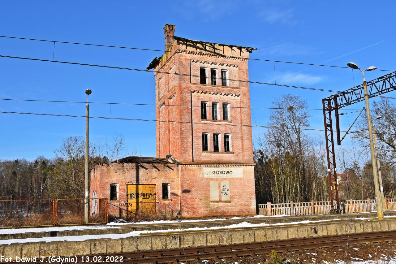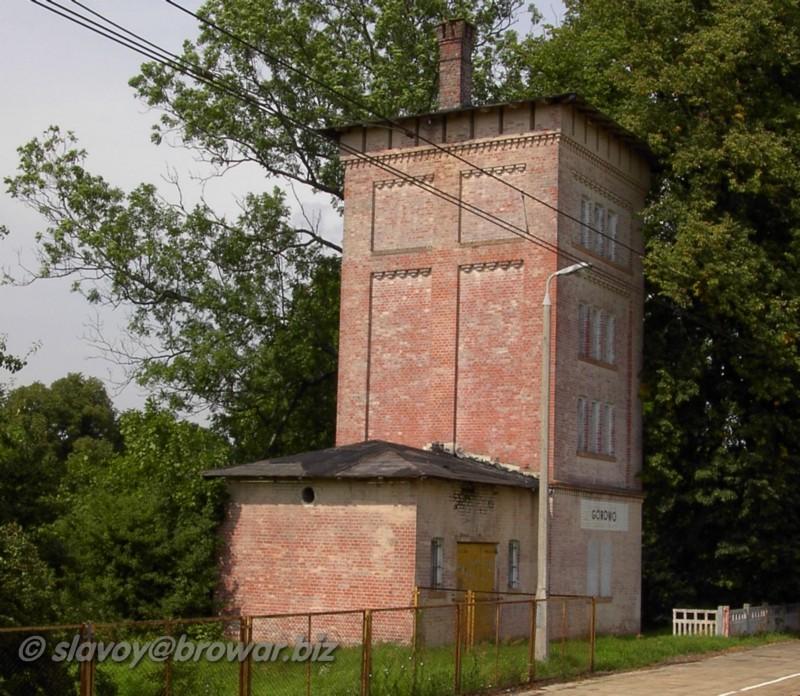 Górowo, km 337,5. Widok na wieżę wodną od strony podjazdu. Tory z lewej strony obiektu.