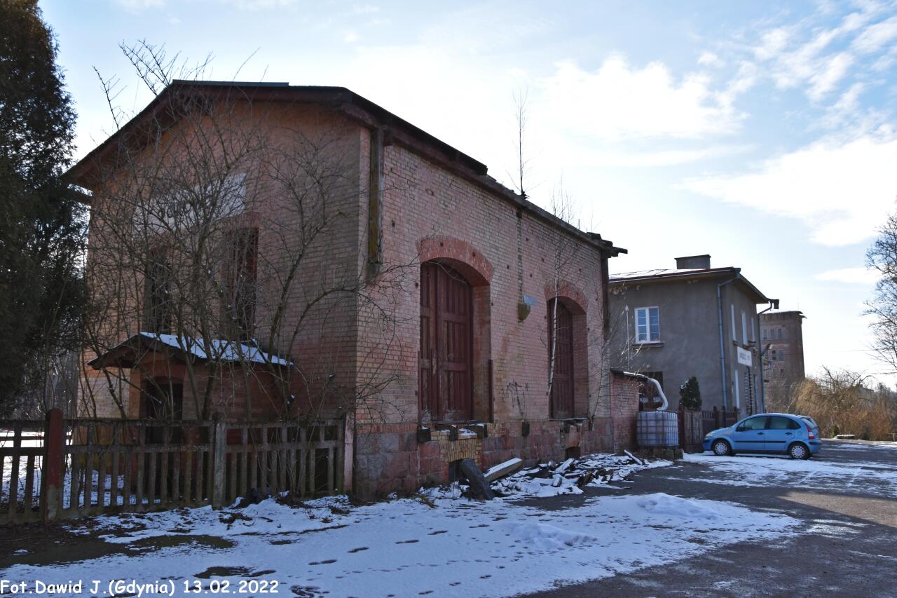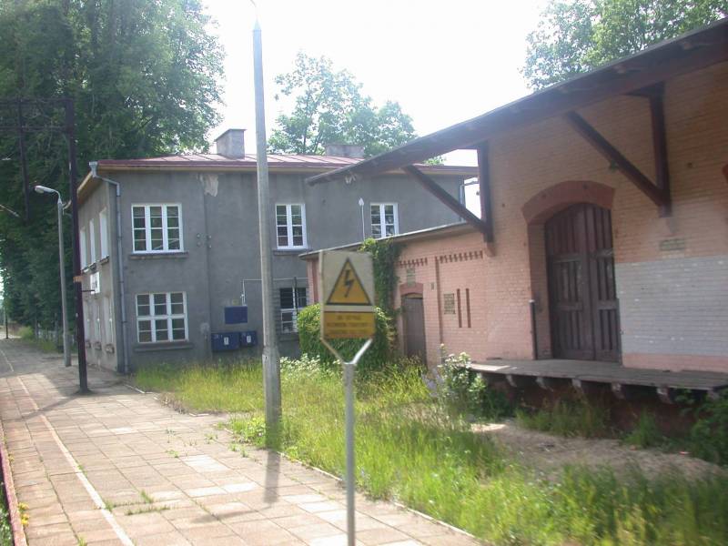Budynek dworcowy i budynek magazynu. Obiekty widoczne od strony torów. W lewo Czerwonka/Olsztyn Główny, w prawo Korsze/Ełk.