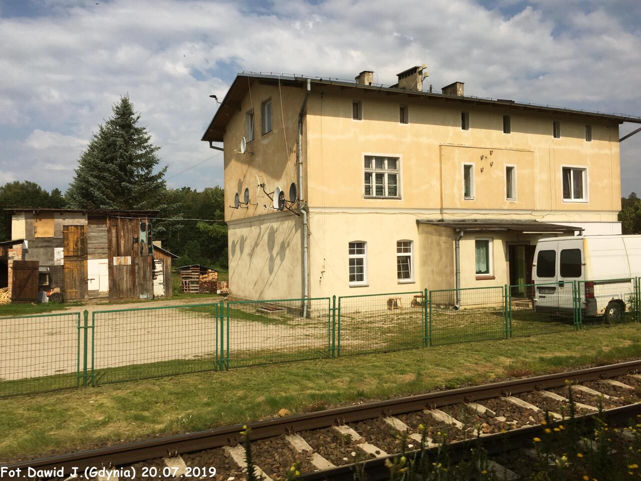 Kolejowy budynek mieszkalny i pobliski budynek gospodarczy. Obiekty widoczne od strony torów. W lewo Czerwonka/Olsztyn Główny, w prawo Korsze/Ełk.