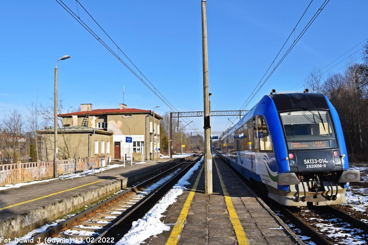 Widok z peronu 2 w kierunku Korsz/Ełku. Budynek dworcowy znajduje się po lewej stronie. Pociąg SA133-014 realizujący kurs PR z Olsztyna Głównego do Ełku przez Korsze, znajduje się po prawej stronie.