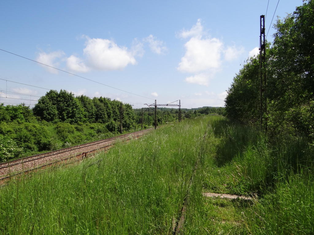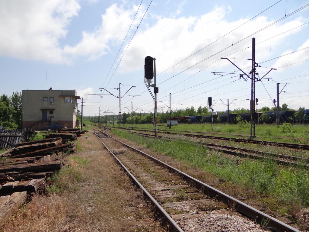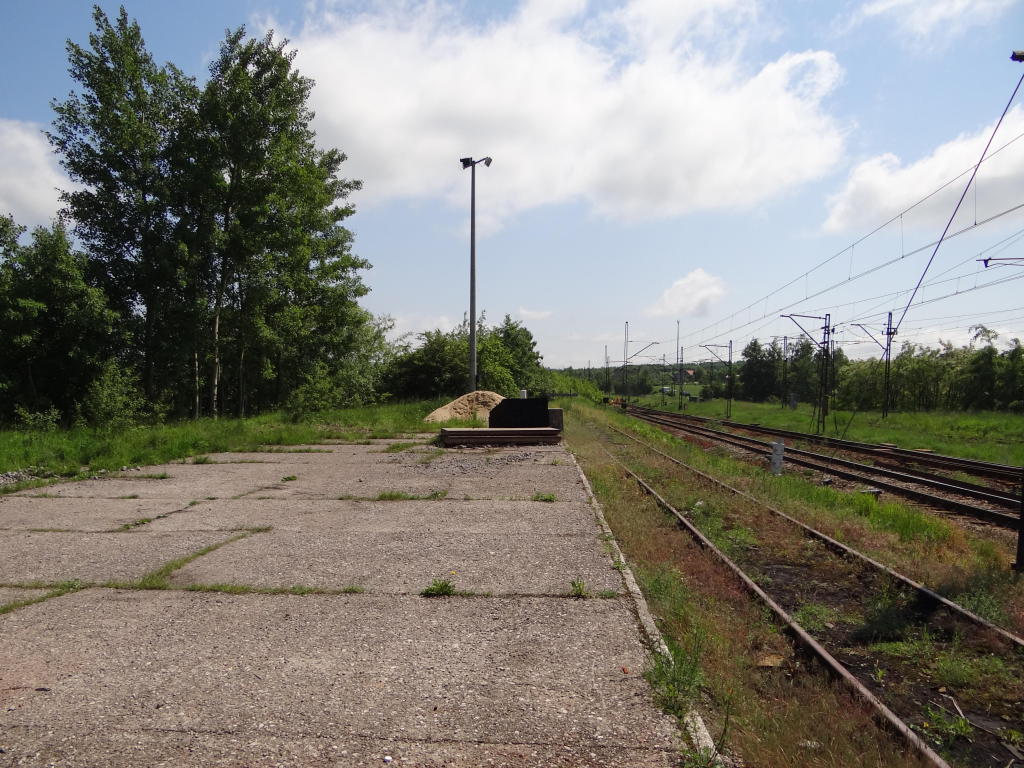 Wschodnia głowica rozjazdowa; wyjazd na Skarżysko-Kamienną. Plac ładunkowy o długości ok. 40 m. Widok w kierunku Skarżyska-Kamiennej. 159,7 km.