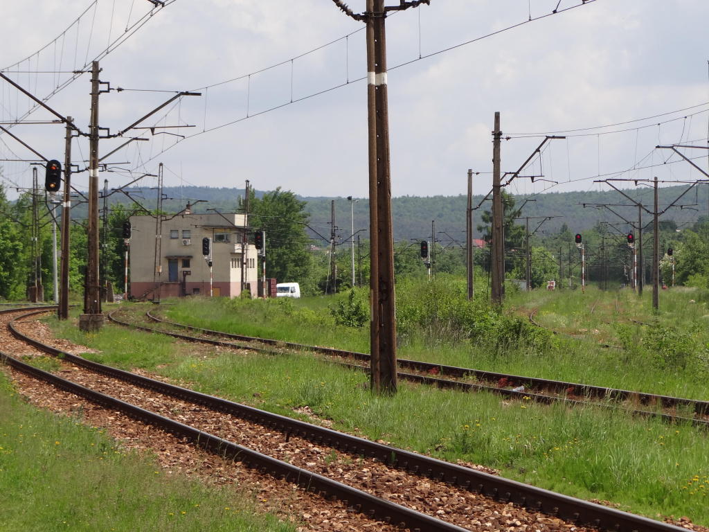 Wschodnia głowica rozjazdowa; wyjazd na Skarżysko-Kamienną. Widoczny wiadukt w Kamionkach. Widoczna nastawnia dysponująca Ła. Widok w kierunku Kielc. 159,6 km.