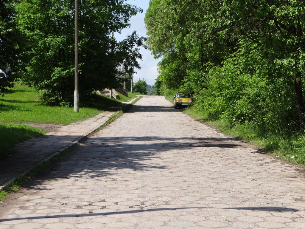 Droga dojazdowa do budynku dworcowego. Po lewej poza kadrem budynek mieszkalny. Widok w kierunku Kielc. 160,1 km.