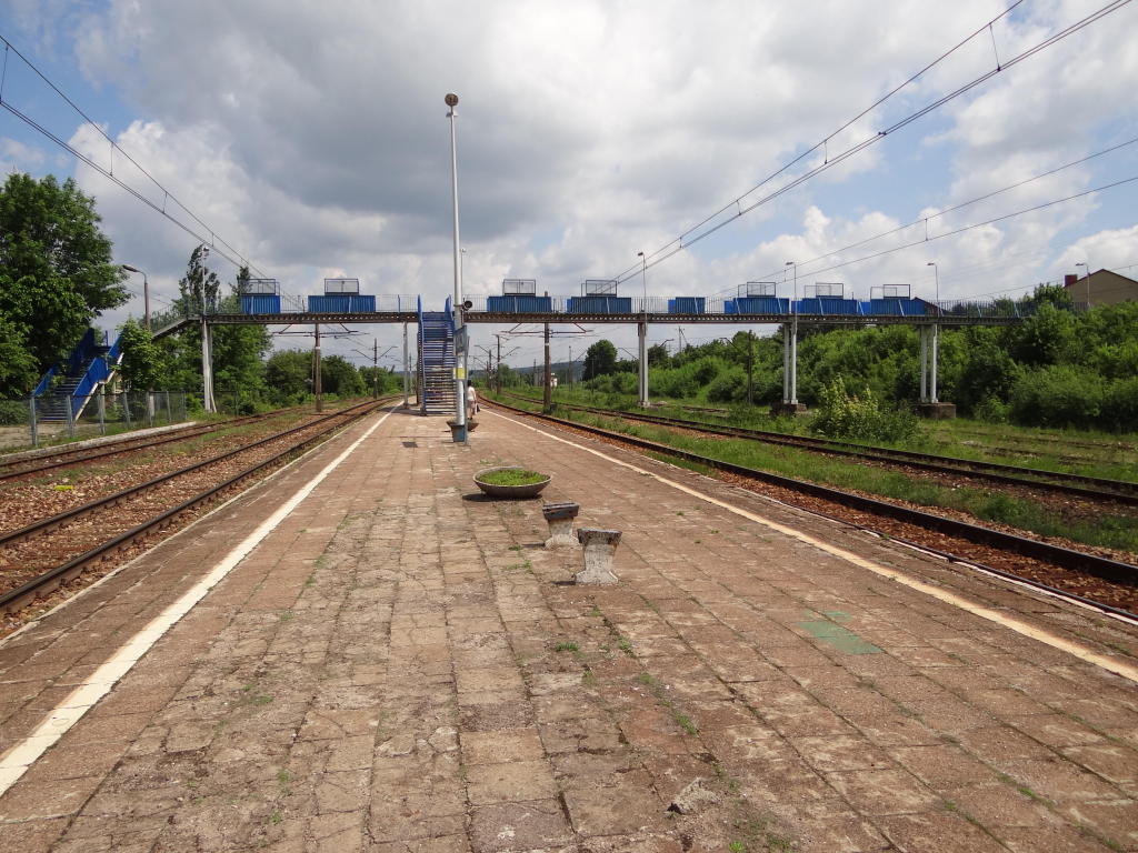Kładka. Peron wyspowy. Po lewej poza kadrem budynek dworcowy. Widok w kierunku Skarżyska-Kamiennej. 160,2 km.