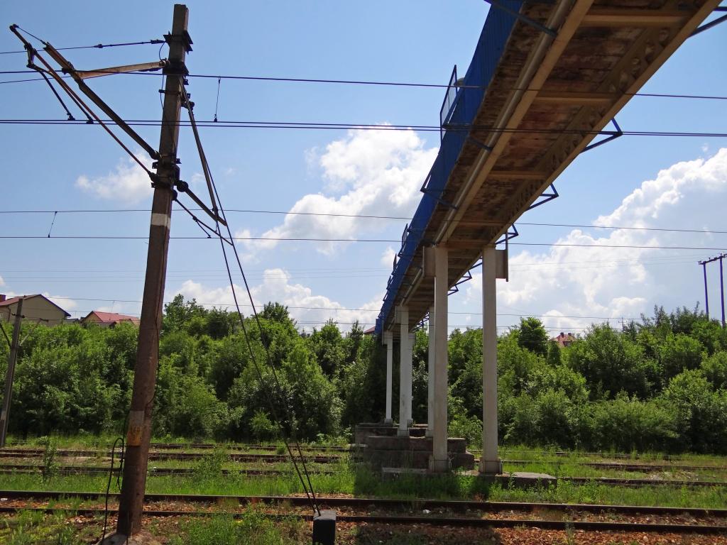 Kładka. Konstrukcja wsporcza sieci trakcyjnej: słup betonowy ŻK, wysięgnik teownikowy, wysięg pomocniczy teownikowy, izolatory dwukloszowe. Wysięgnik obniża sieć trakcyjną do poziomu bezpiecznego pod kładką. W lewo Skarżysko-Kamienna, w prawo Kielce. 160,2 km.