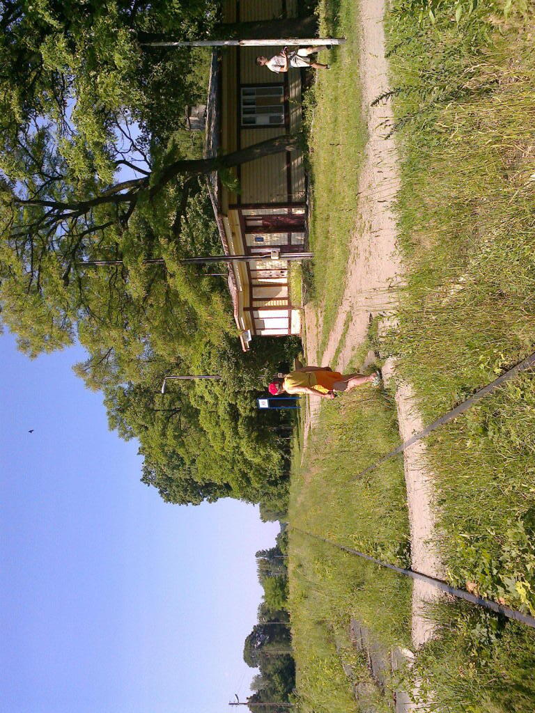 Uhrusk. Perony, z lewej, ukryty w drzewach stoi budynek dworca. Widok w kierunku Chełma.