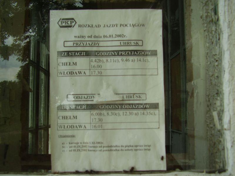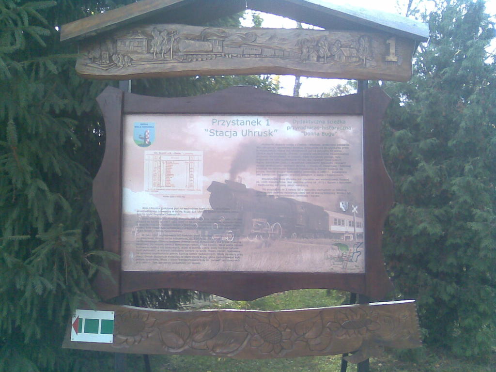 Stacja Uhrusk (miejscowość Wola Uhruska). Widoczna nowa tablica z nazwą stacji, gdyż linią włodawską jeździły szynobusy latem i jesienią 2012 roku. W lewo Sobibór i Włodawa, w prawo Chełm.
