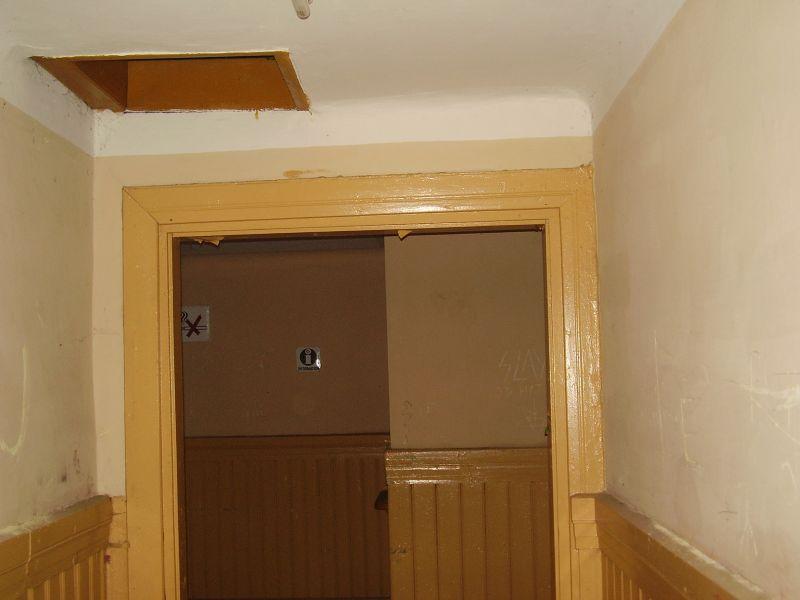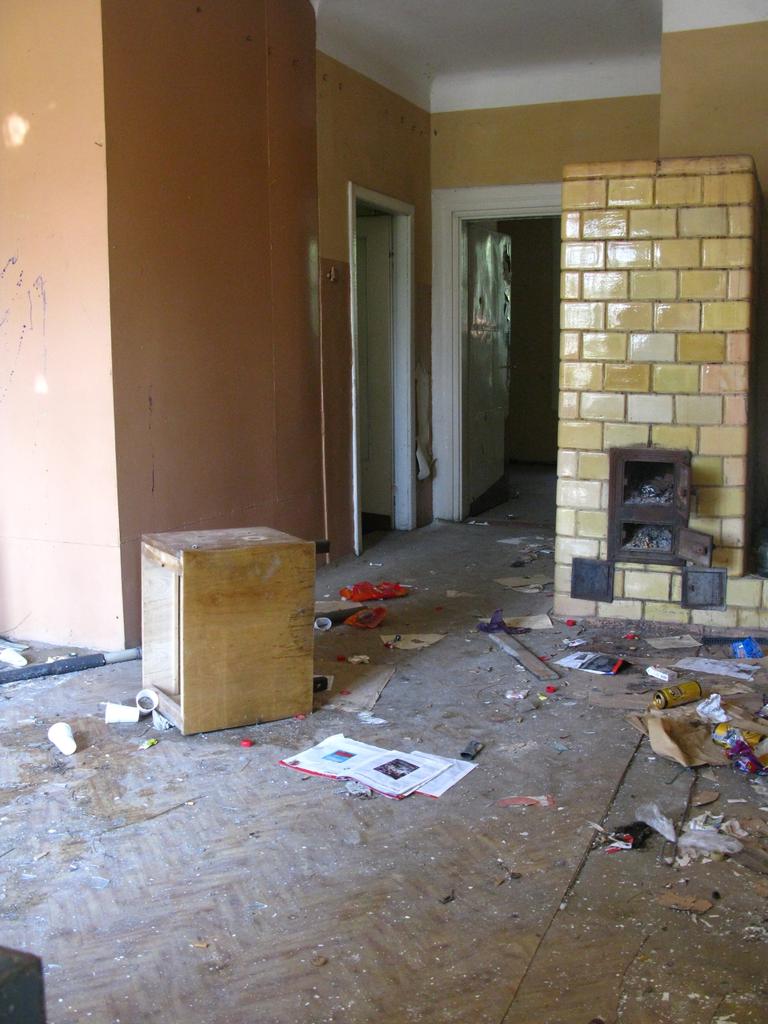 Uhrusk. Wnętrze dworca widoczne przez wybitą szybę w drzwiach wejściowych. Jak widać brak śladów dewastacji-wszystko gotowe do użytku, tylko odmalować i wyczyścić piece grzewcze.