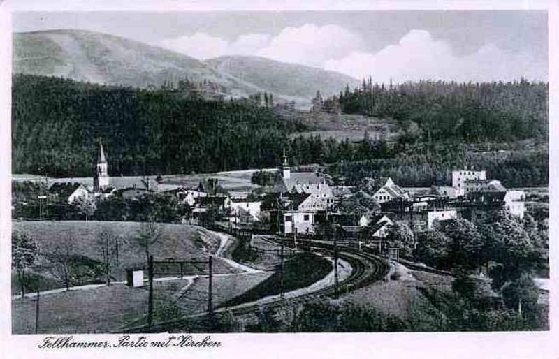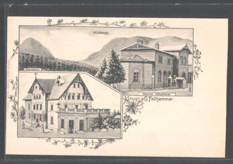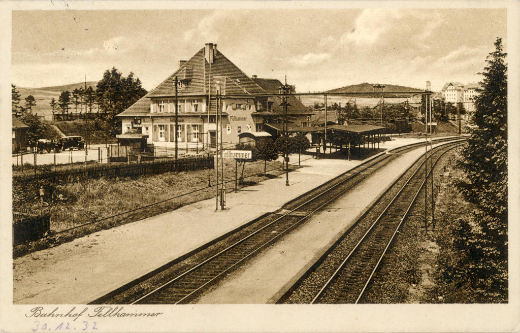 EP 216 in Fellhammer (Sammlung Rampp) - EP 216 w Boguszowie Gorcach Wsch. (Z kolekcji Rampp). Widok perony południowe (1 - z lewej i 2 - z prawej), obsługujące ruch na Śląskiej Kolei Górskiej w kierunku północno-wschodnim: Wałbrzych Główny i Wałbrzych Szczawienko (przez Biały Kamień). Z lewej fragment budynku dworca.