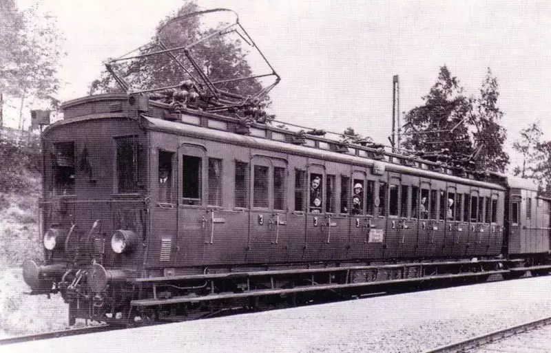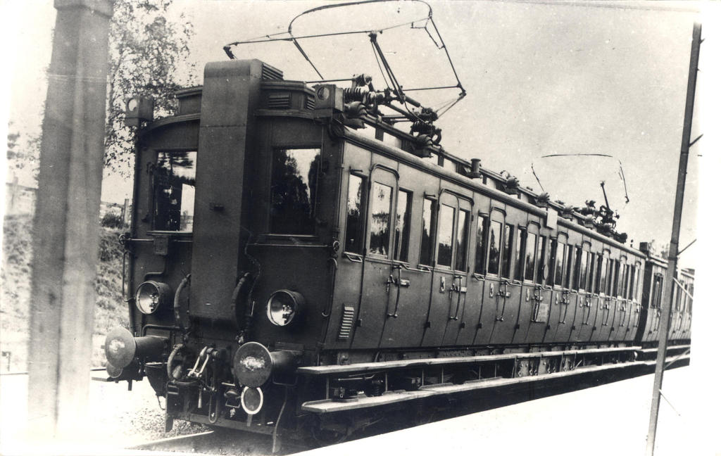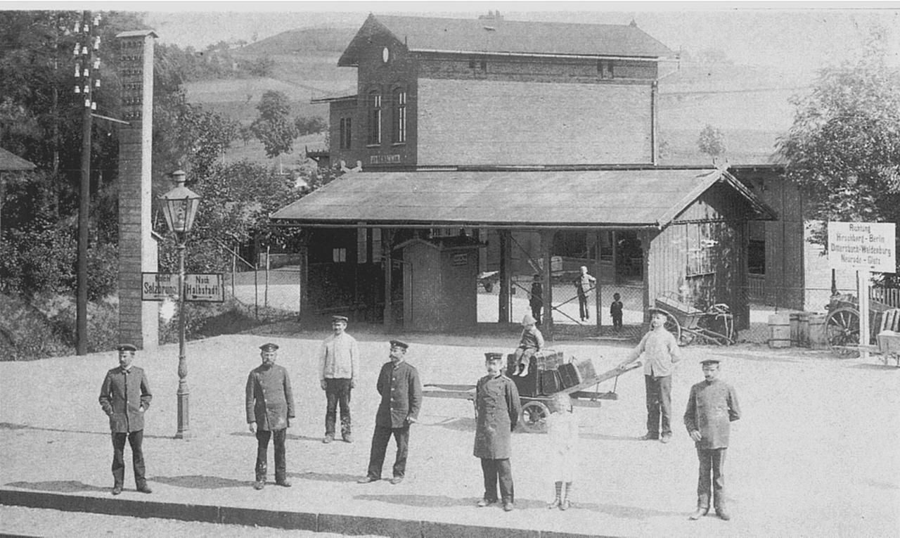 Pierwszy budynek dworca widziany od strony peronów północnych, obsługujących ruch po linii z obecnym numerem 291. Widok w kierunku południowym.
