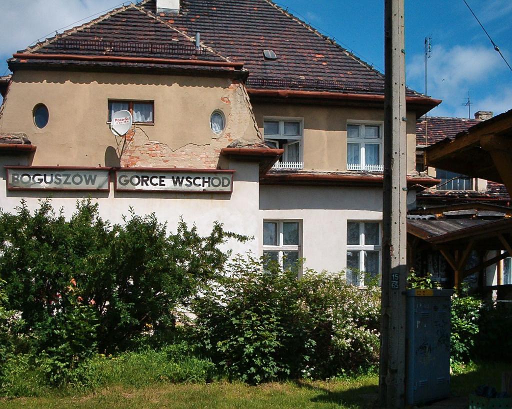 Budynek dworca Boguszów Gorce Wschód od strony peronów północnych (3 i 4), obsługujących ruch na linii nr 291, Wałbrzych Szczawienko - Mieroszów – Meziměstí (CZ). Na pierwszym planie zlikwidowany peron 3, niegdyś kryty wiatą. Pod lukarną widoczne zamurowane wejście do poczekalni.
