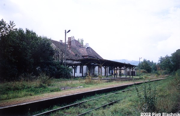 Widok z peronu 2 płn w kierunku Wałbrzycha. Po lewej stronie znajdował się drugi tor linii do Mieroszowa oraz peron 1 płn. W oddali budynek nastawni "BGW".