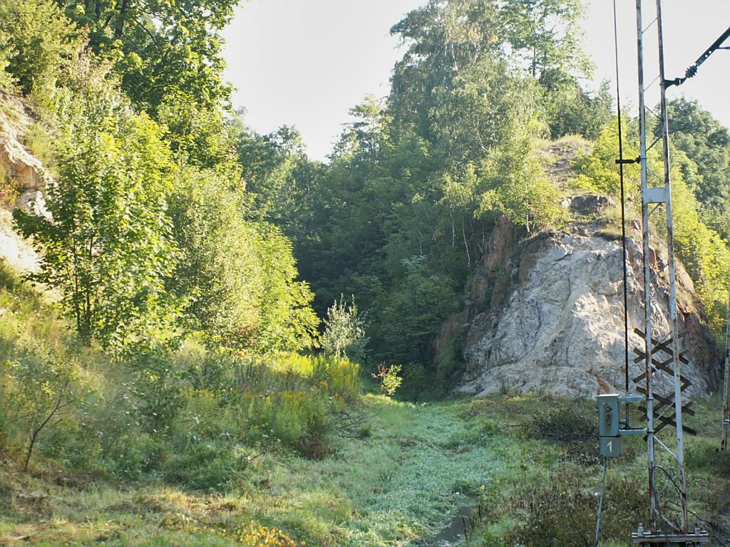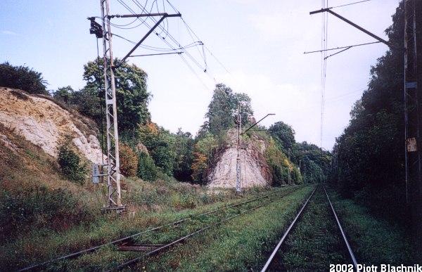 Odbicie rozebranej linii 291 do Wałbrzycha Szczawienko (przez Biały Kamień), od linii 274 do Wałbrzycha Głównego (przy której stoją bramki słupy trakcyjne). W tle słynna skałka. Kierunek północno-wschodni.