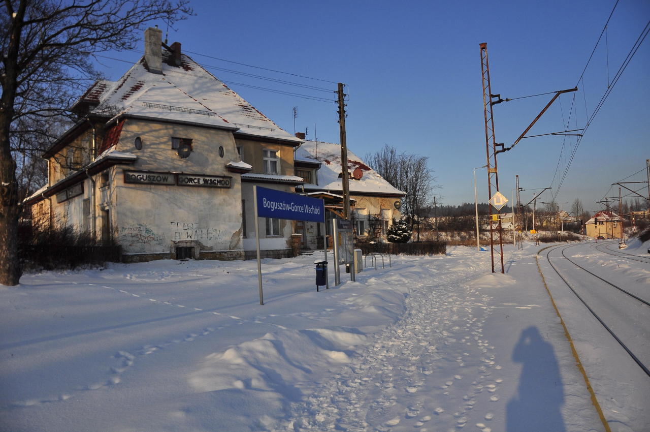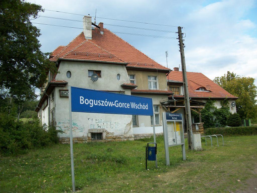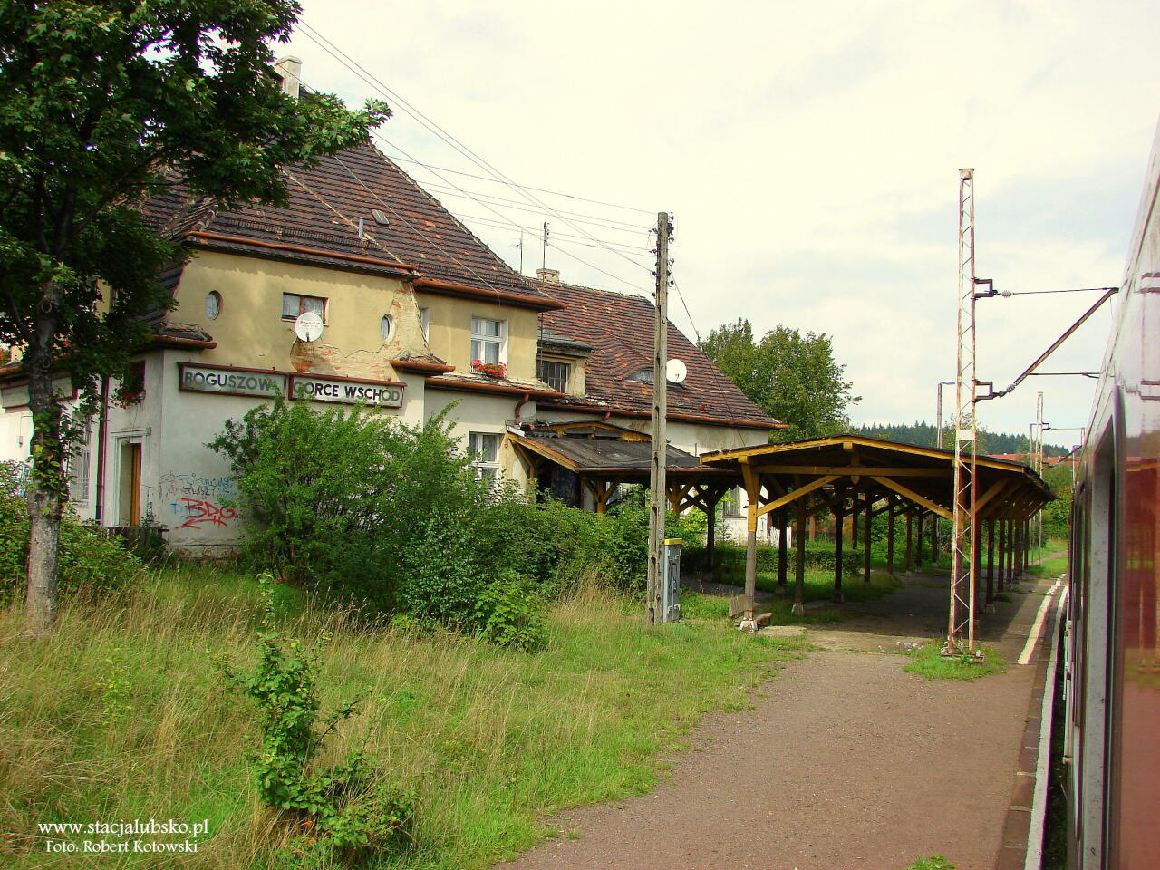Budynek dworca Boguszów Gorce Wschód od strony linii nr 274 Wrocław Świebodzki - Zgorzelec – Görlitz(D) i peronów południowych (1 i 2). Na pierwszym planie peron 1, na którym rozpostarta była wiata, po której został ogryzek przy budynku dworca, nad zamurowanym wejściem do poczekalni. Widok od strony wjazdu z Sędzisławia/Jeleniej Góry.