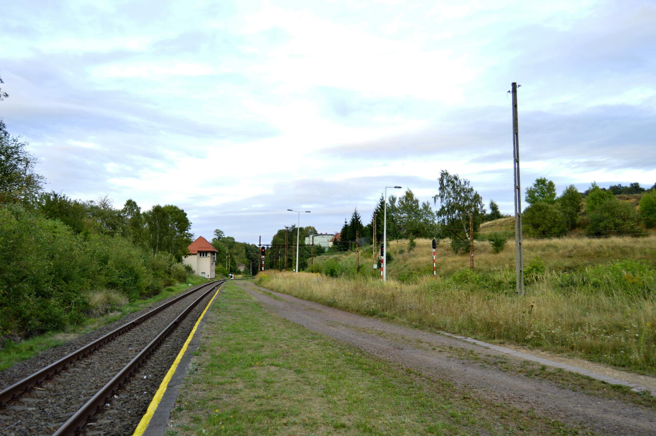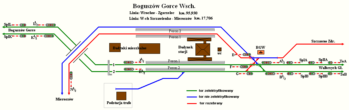 Po lewej tor linii nr 291 Wałbrzych Szczawienko – Mieroszów – Meziměstí(CZ), po prawej tory linii nr 274 Wrocław Świebodzki - Zgorzelec – Görlitz(D). Z lewej nastawnia dysponująca. Widok w kierunku północno-wschodnim: Wałbrzych Główny, kiedyś też Wałbrzych Szczawienko, przez Biały Kamień.