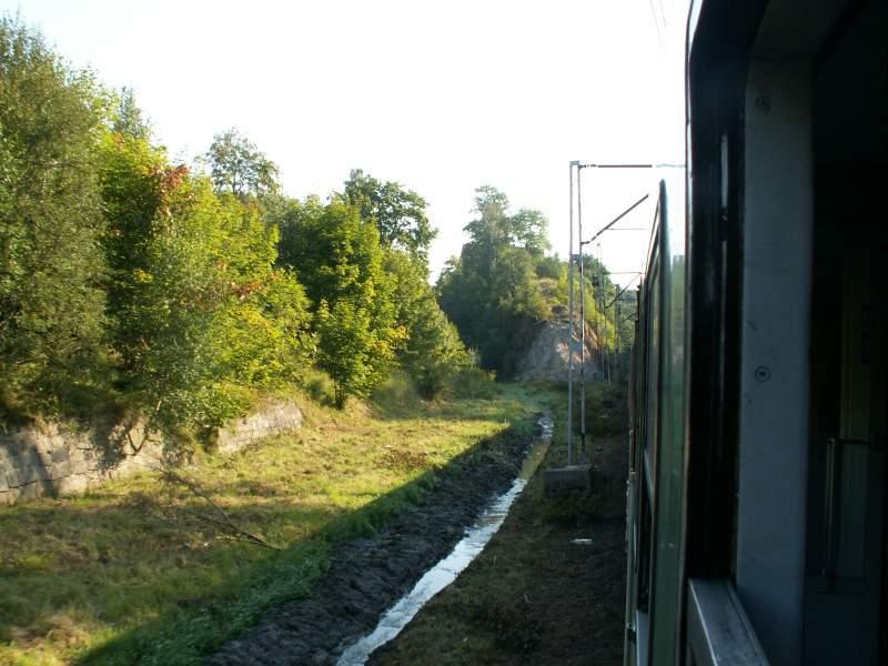 Odbicie rozebranej linii 291 do Wałbrzycha Szczawienko (przez Biały Kamień), od linii 274 do Wałbrzycha Głównego (którą jedzie skład). W tle słynna skałka. Kierunek północno-wschodni.