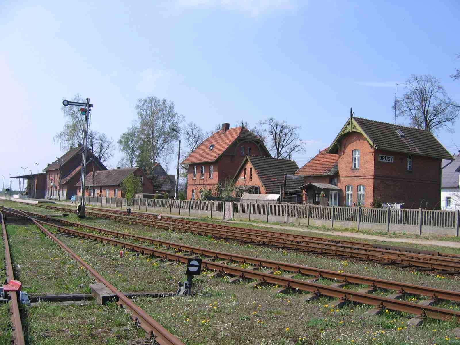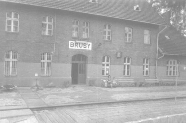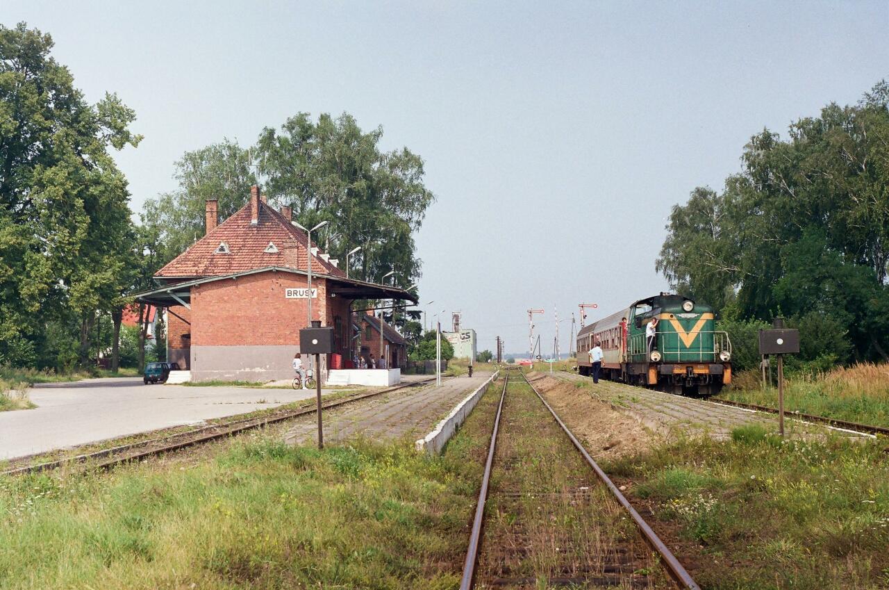 Skan zdjęcia przedstawia dworzec w Brusach. Fotografia wykonana z okna pociągu rel. Chojnice - Kościerzyna, nr R 2237. W lewo Chojnice, w prawo Lipusz/Kościerzyna.