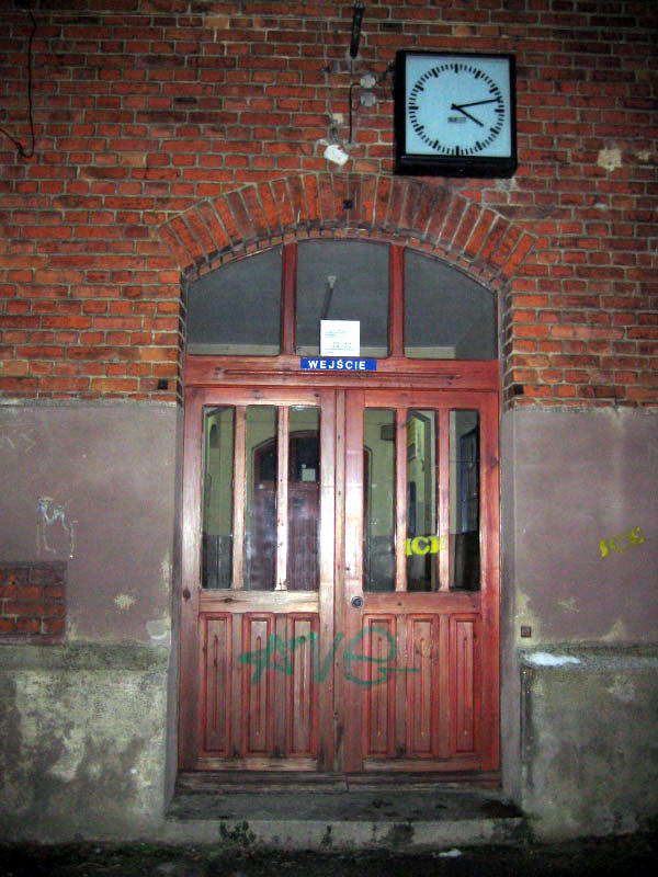 Stacja PKP Brusy. Drzwi wejściowe do budynku dworcowego od strony miasta.