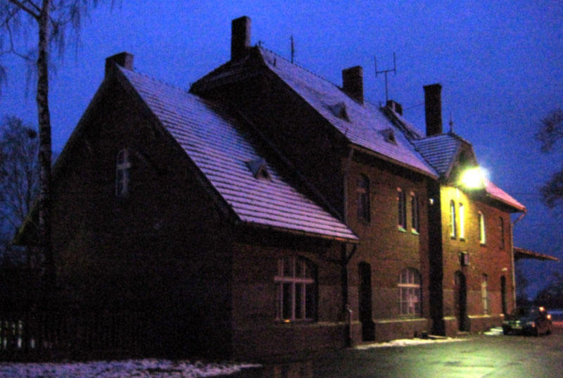 Stacja PKP Brusy. Budynek dworcowy widziany o zmroku od strony drogi dojazdowej.