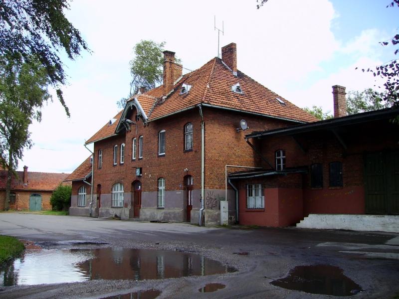 Budynek dworca z nastawnią od strony peronów i wjazdu z Lipusza/Kościerzyny. W tle magazyn towarowy.