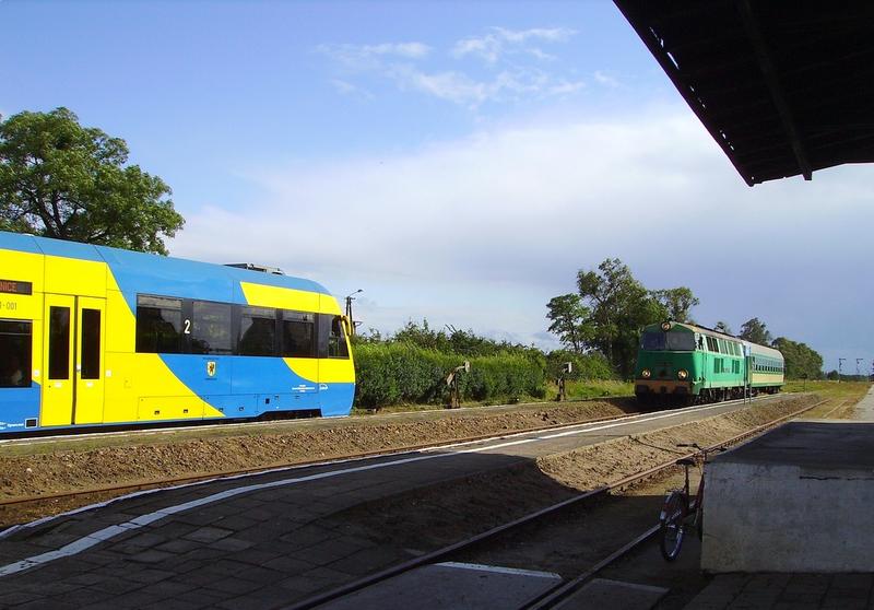Popołudniowa mijanka; tego dnia SU45+wagon za szynobus z Chojnic do Koscierzyny. Na pierwszym planie bardzo "ważny" w czasie mijanki rower.