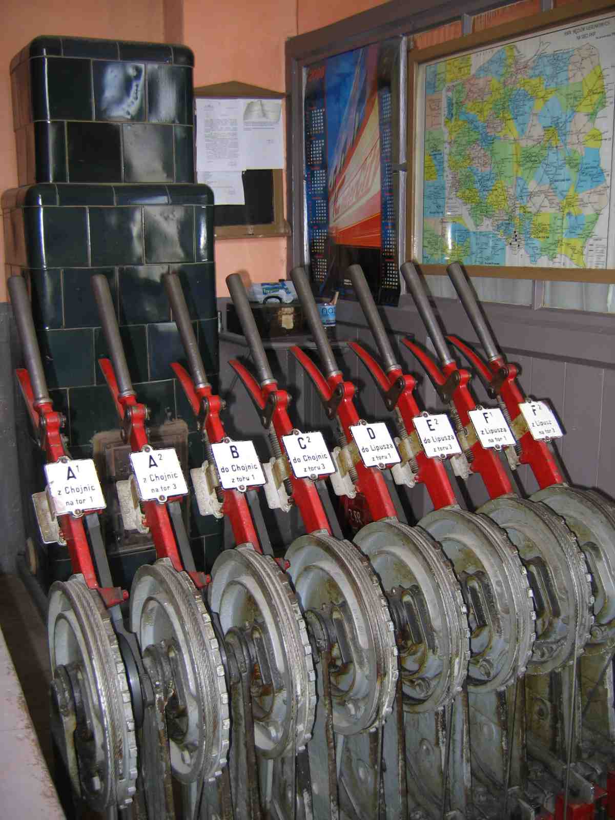 Popołudniowa mijanka 1 Po wjeździe szynobusa z Kościerzyny Dyżurny udaje się do zwrotnicy ustawić przebieg dla pociągu jadącego w przeciwnym kierunku. W czasie wjazdu obsługuje widoczny pulpit sterowania rogatek przejazdowych (jedyne nowoczesne urządzenie na stacji). W lewo Lipusz/Kościerzyna, w prawo Chojnice.