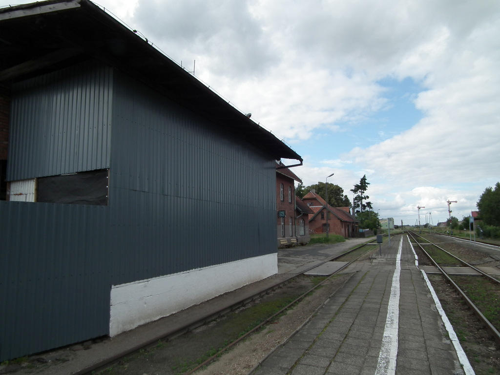 Skład budowlany działający na stacji zabudował rampę blachą, co bardzo zepsuło widok na dworzec od strony torów. Widok w kierunku Lipusza/Kościerzyny.