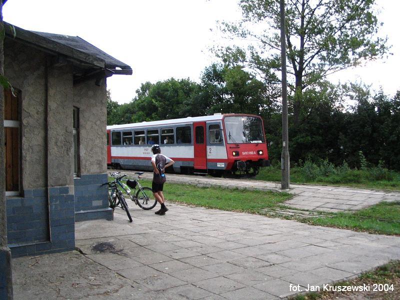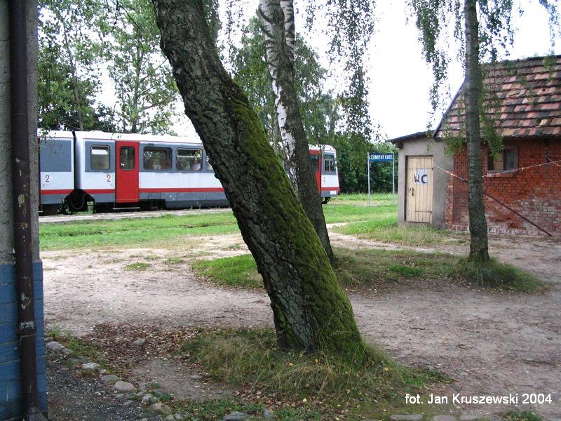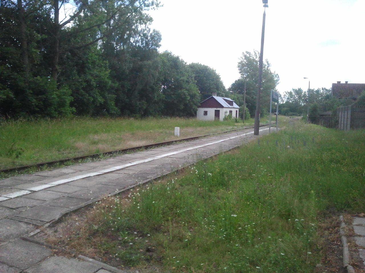 Widok na peron od strony wsi. Przy peronie stoi pociąg z Kościerzyny do Chojnic (w prawo). Z prawej fragment stacyjnej toalety.