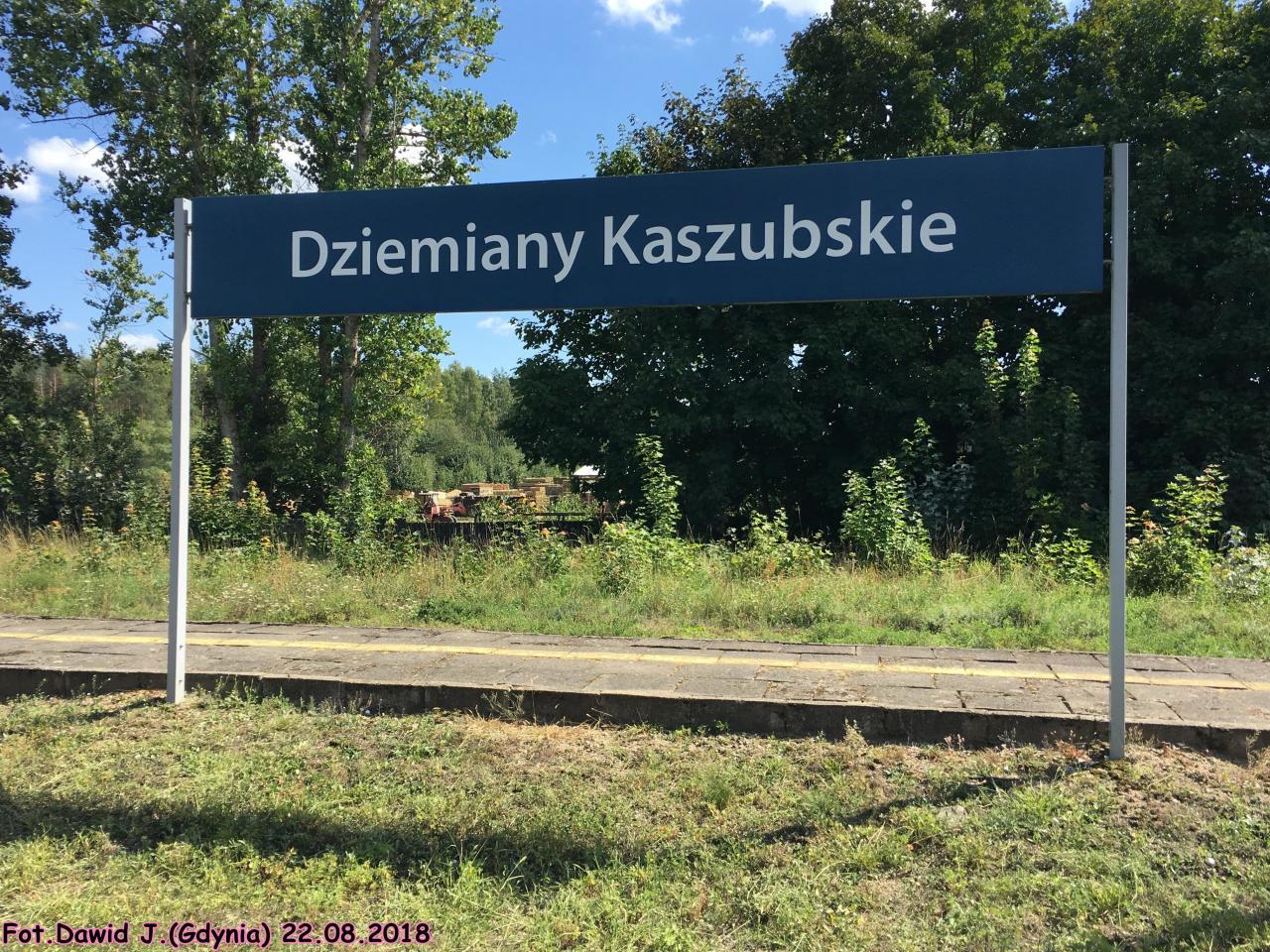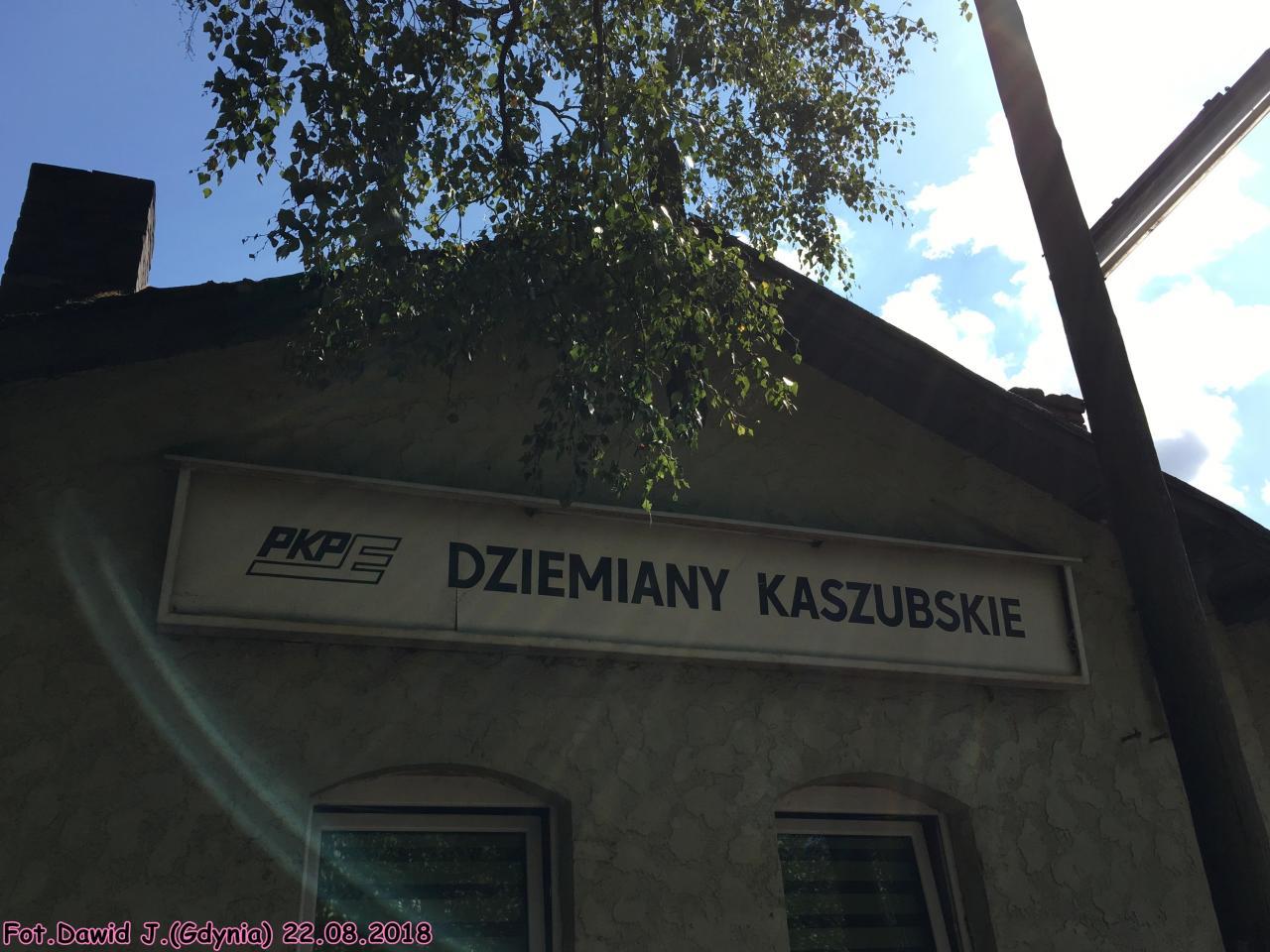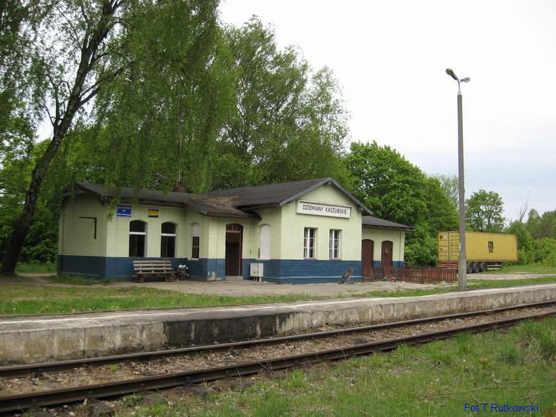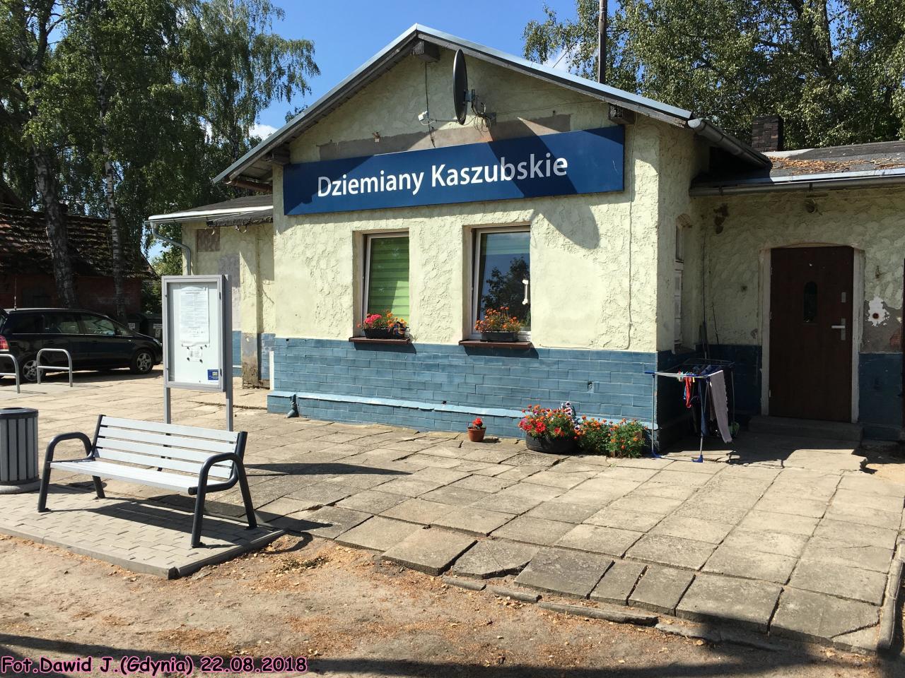 Stacja Dziemiany Kaszubskie. Widok na peron i budynek dworca. W lewo Chojnice, w prawo Lipusz/Kościerzyna.