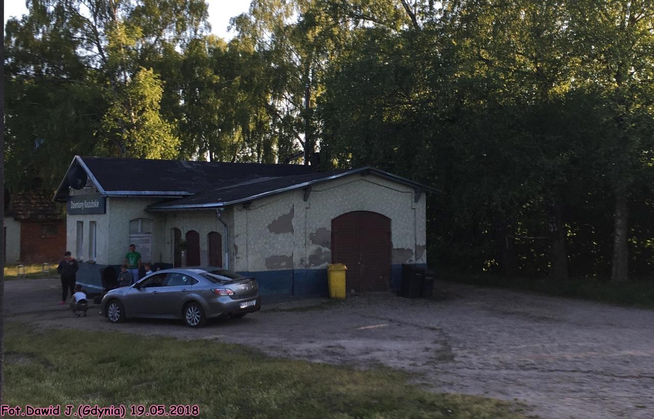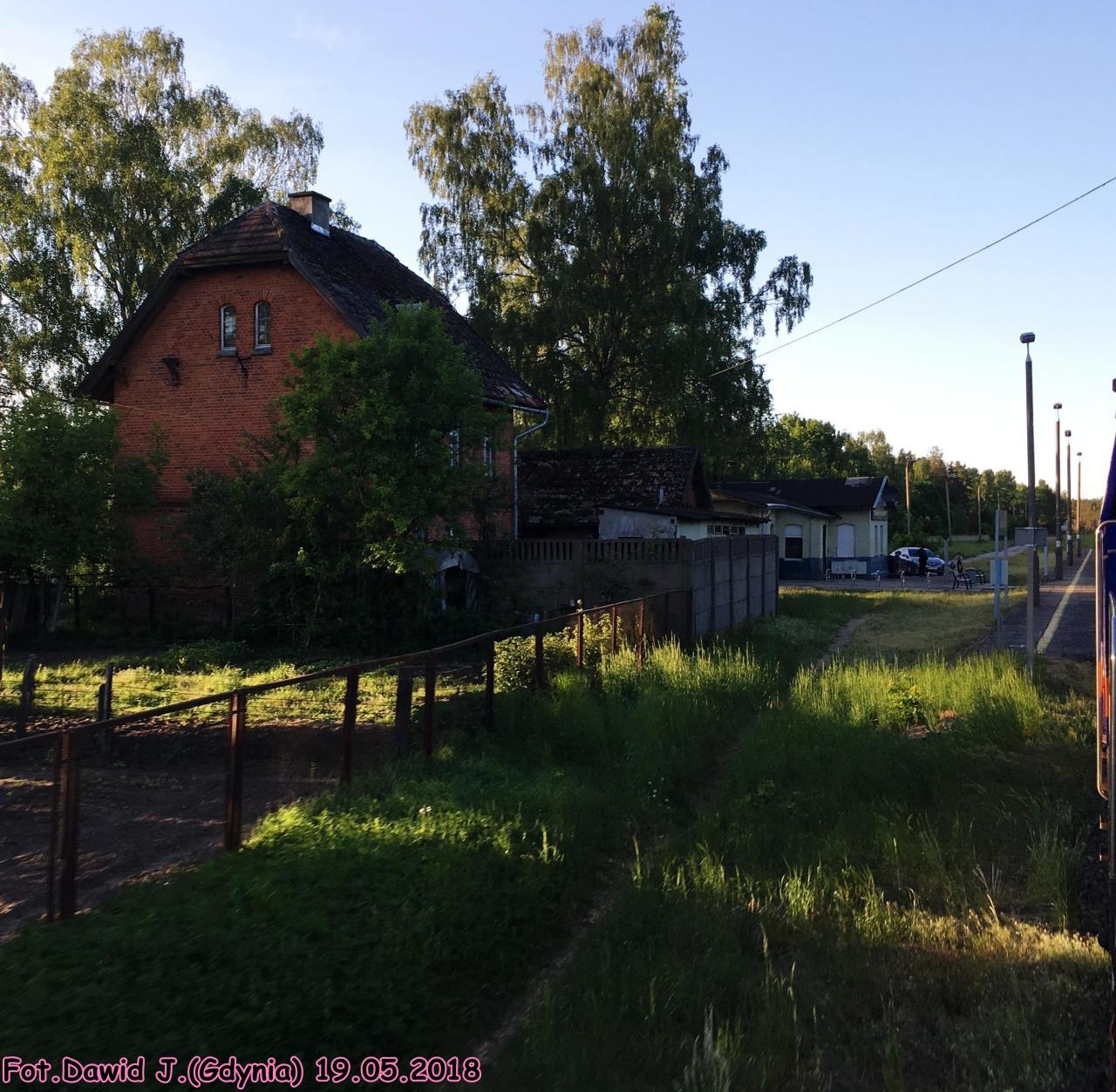 Widok na peron i w kierunku Lipusza/Kościerzyny. Kolejowy budynek mieszkalny z przyległą częścią z pomieszczeniami WC (ul. Dworcowa 1) i budynek dworcowy, znajdują się po lewej stronie.