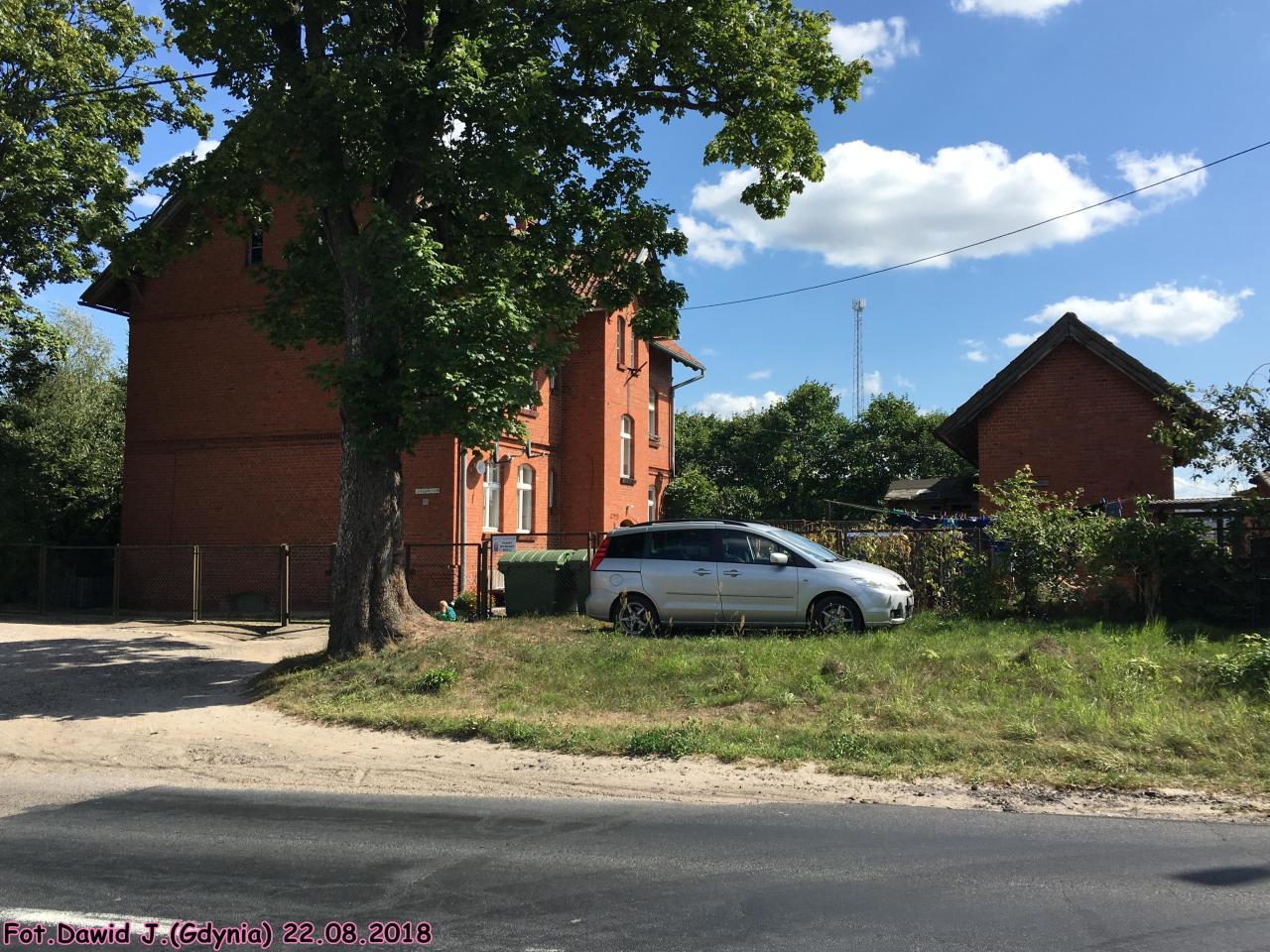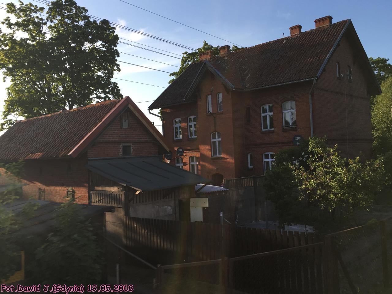 Kolejowy budynek mieszkalny (ul. Dworcowa 2) i pobliski budynek gospodarczy. Obiekty widoczne od strony podjazdu. W lewo Lipusz/Kościerzyna, w prawo Brusy/Chojnice.