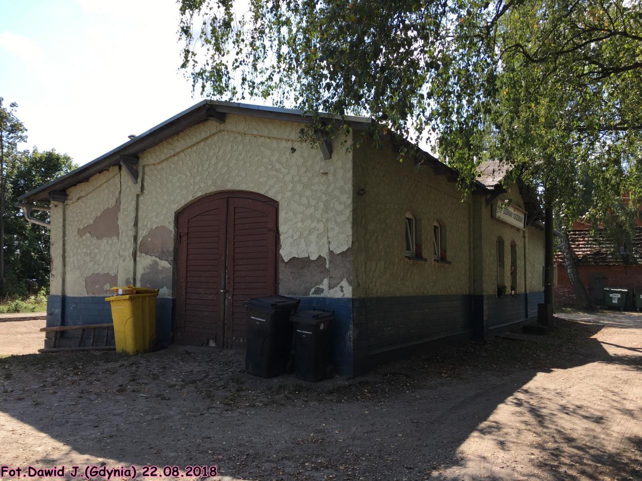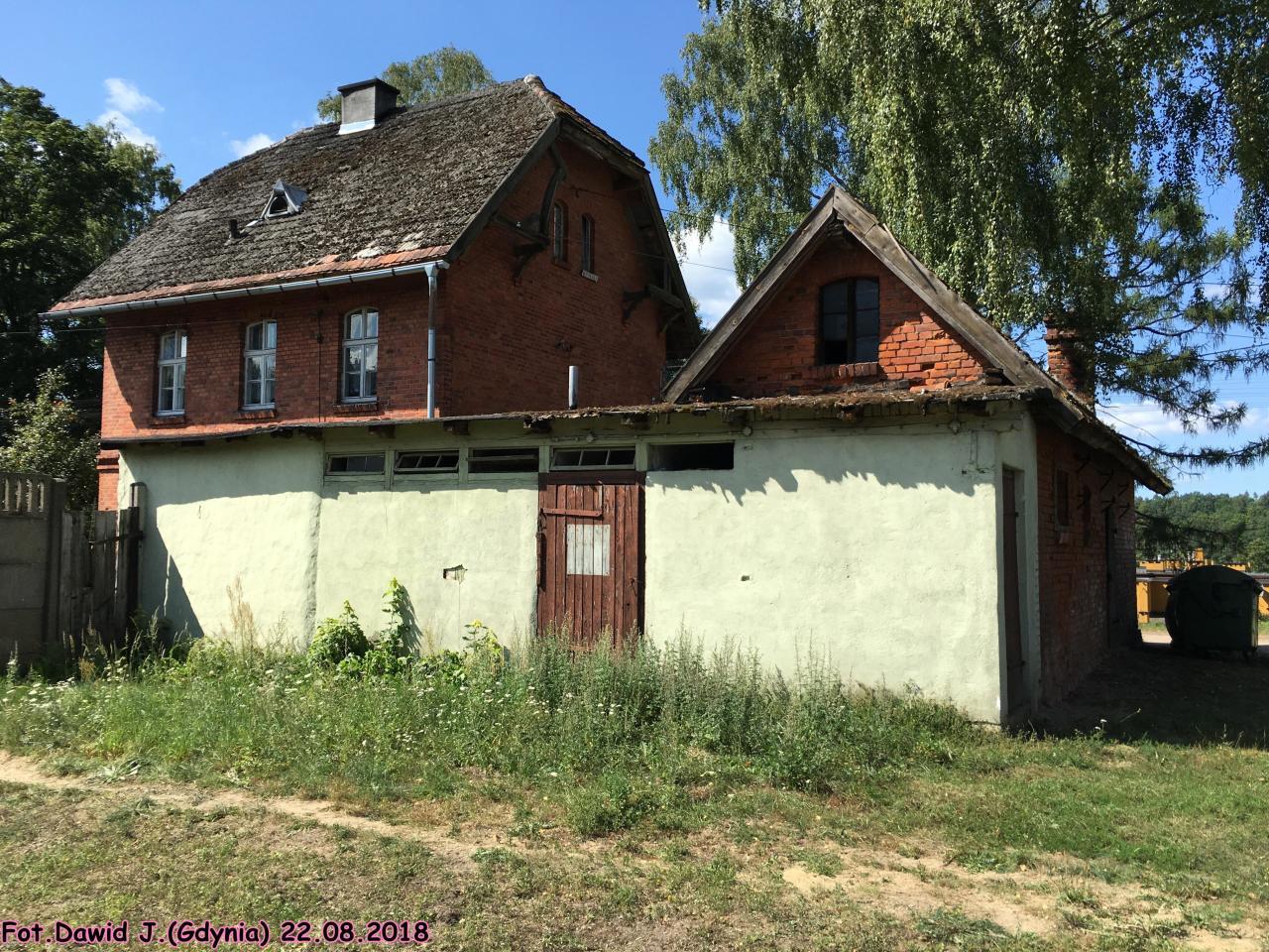 Kolejowy budynek mieszkalny z przyległą częścią z pomieszczeniami WC (ul. Dworcowa 1), widoczny od strony torów. W lewo Brusy/Chojnice, w prawo Lipusz/Kościerzyna.