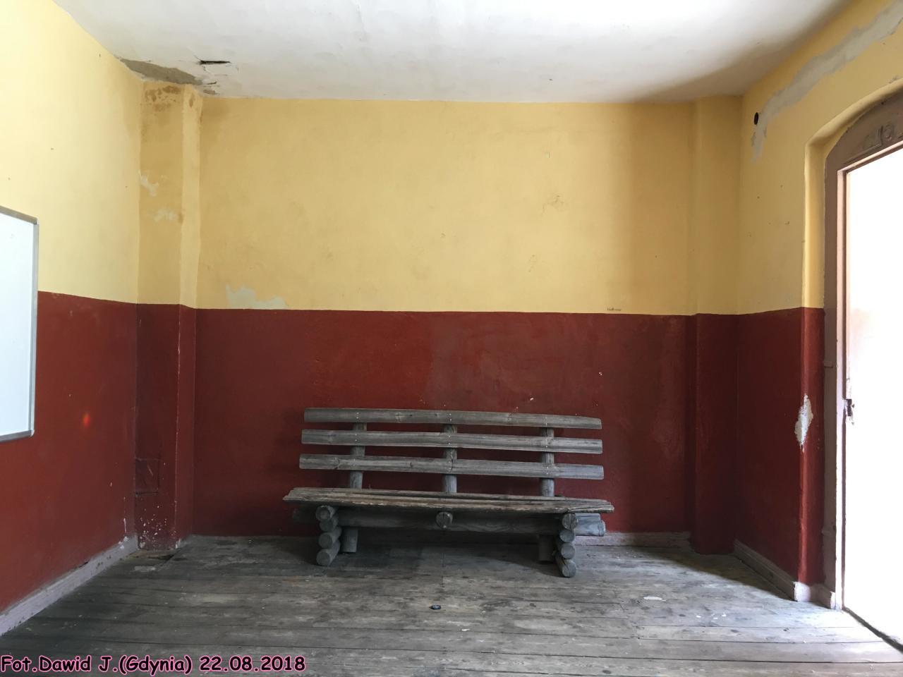 Tablica z nazwą przystanku osobowego, sprzed kilkudziesięciu lat. Tablica umieszczona jest na budynku dworcowym, od strony podjazdu. W lewo Lipusz/Kościerzyna, w prawo Brusy/Chojnice.