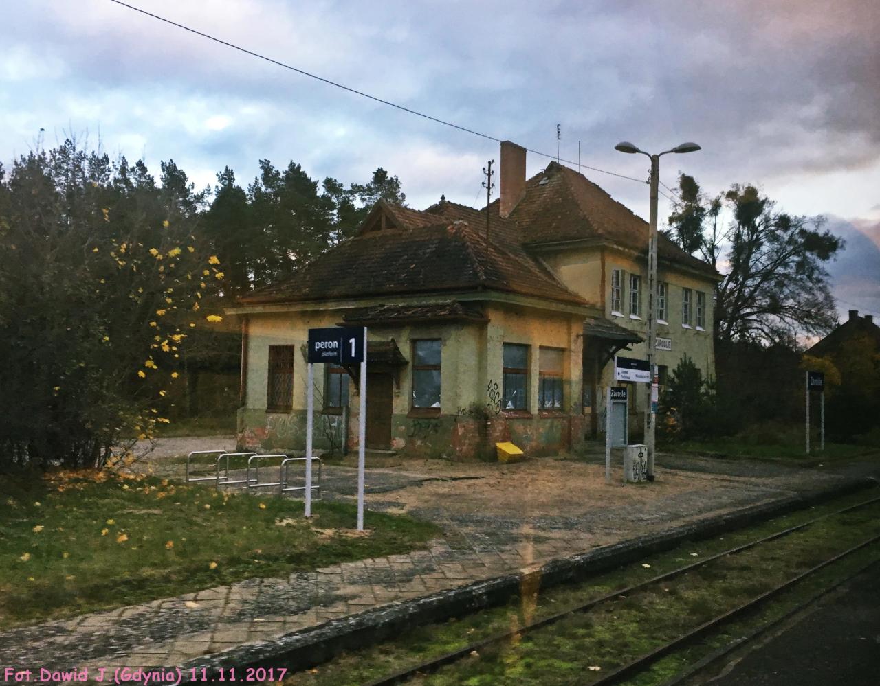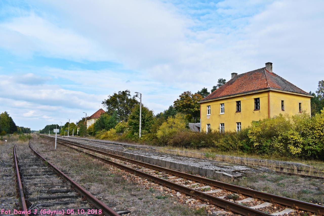 Budynek dworcowy widoczny od strony torów. Na peronie 1 znajdują się: tablica informacyjna z nazwą przystanku osobowego i tablica z kierunkami. Widok w kierunku Wierzchucina/Bydgoszczy Głównej.