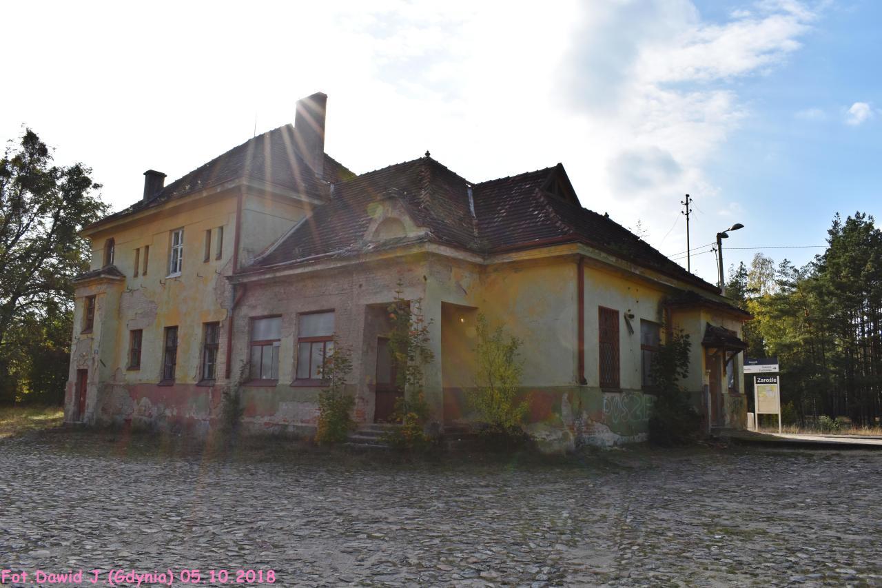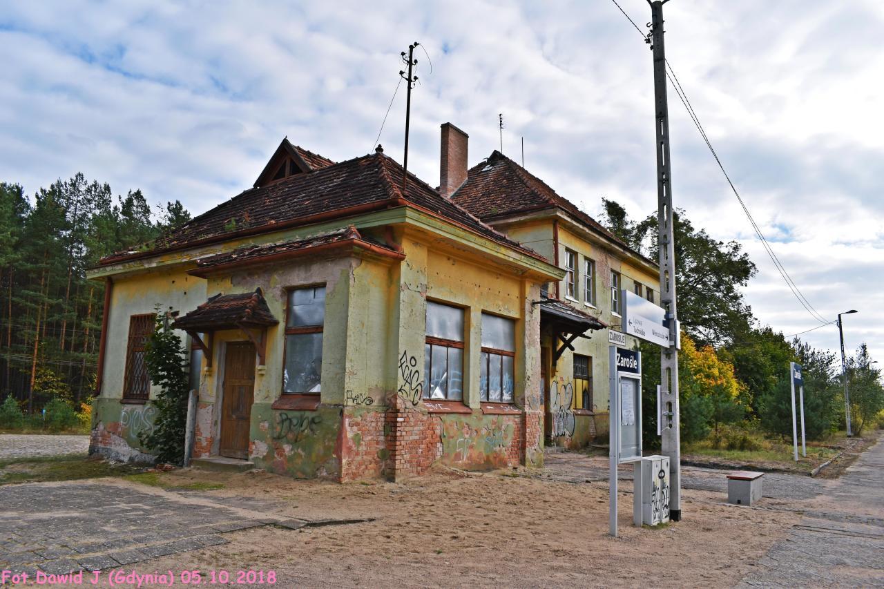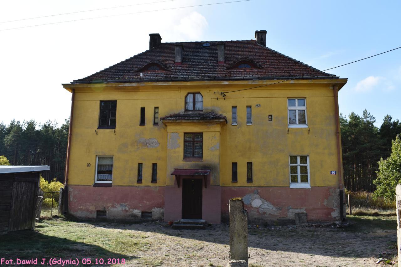 Kolejowy budynek mieszkalny (Brzozowe Błota 10) widoczny od strony podjazdu. W lewo Wierzchucin/Bydgoszcz Główna, w prawo Lipowa Tucholska/Gdynia Główna.