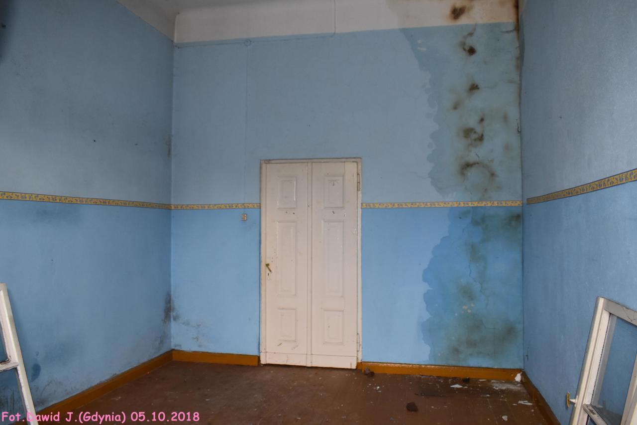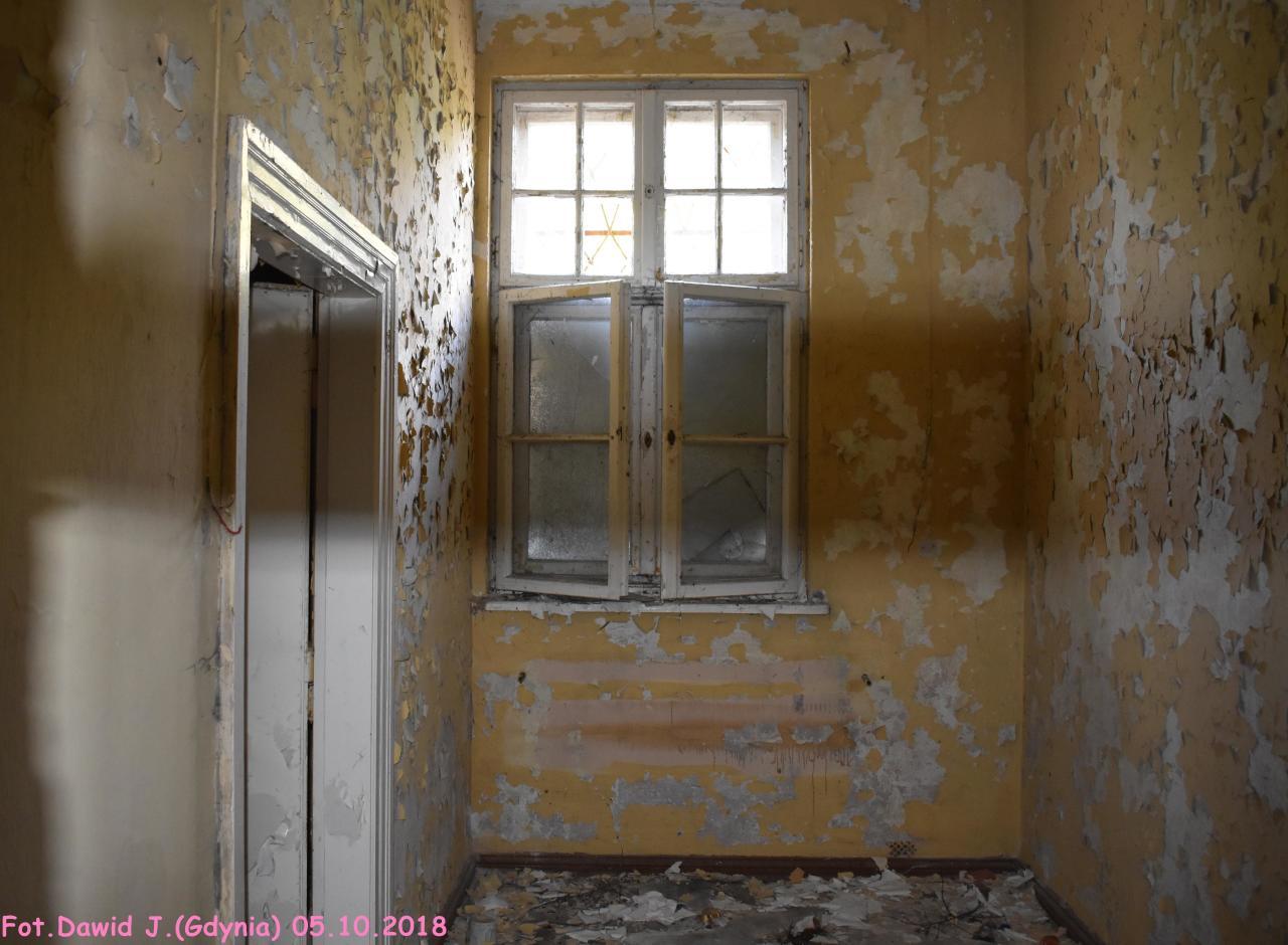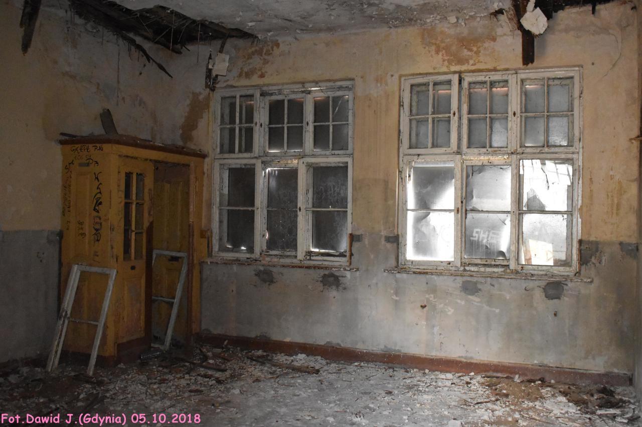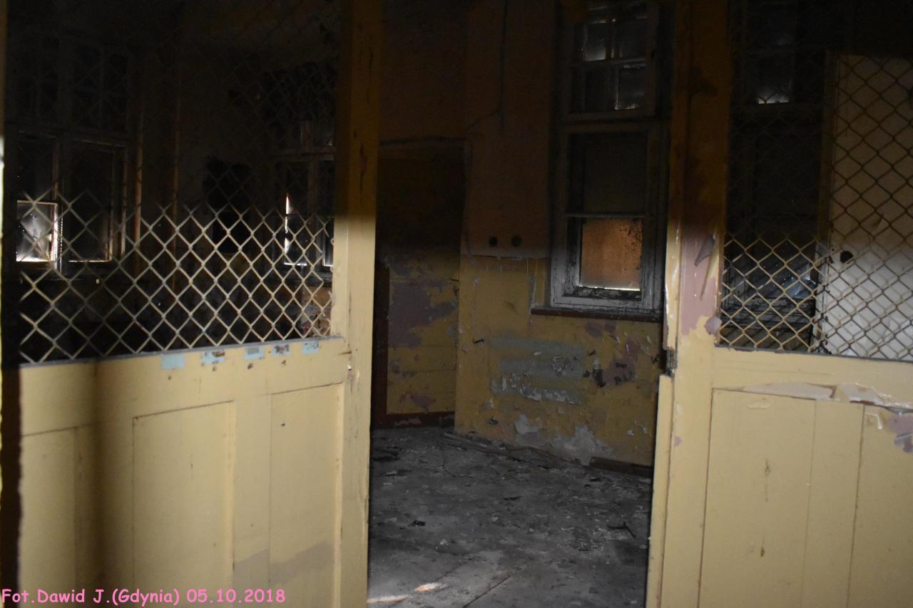 Wnętrze budynku dworcowego. Pomieszczenie w którym była kasa bagażowa i pomieszczenie dyżurnego ruchu.