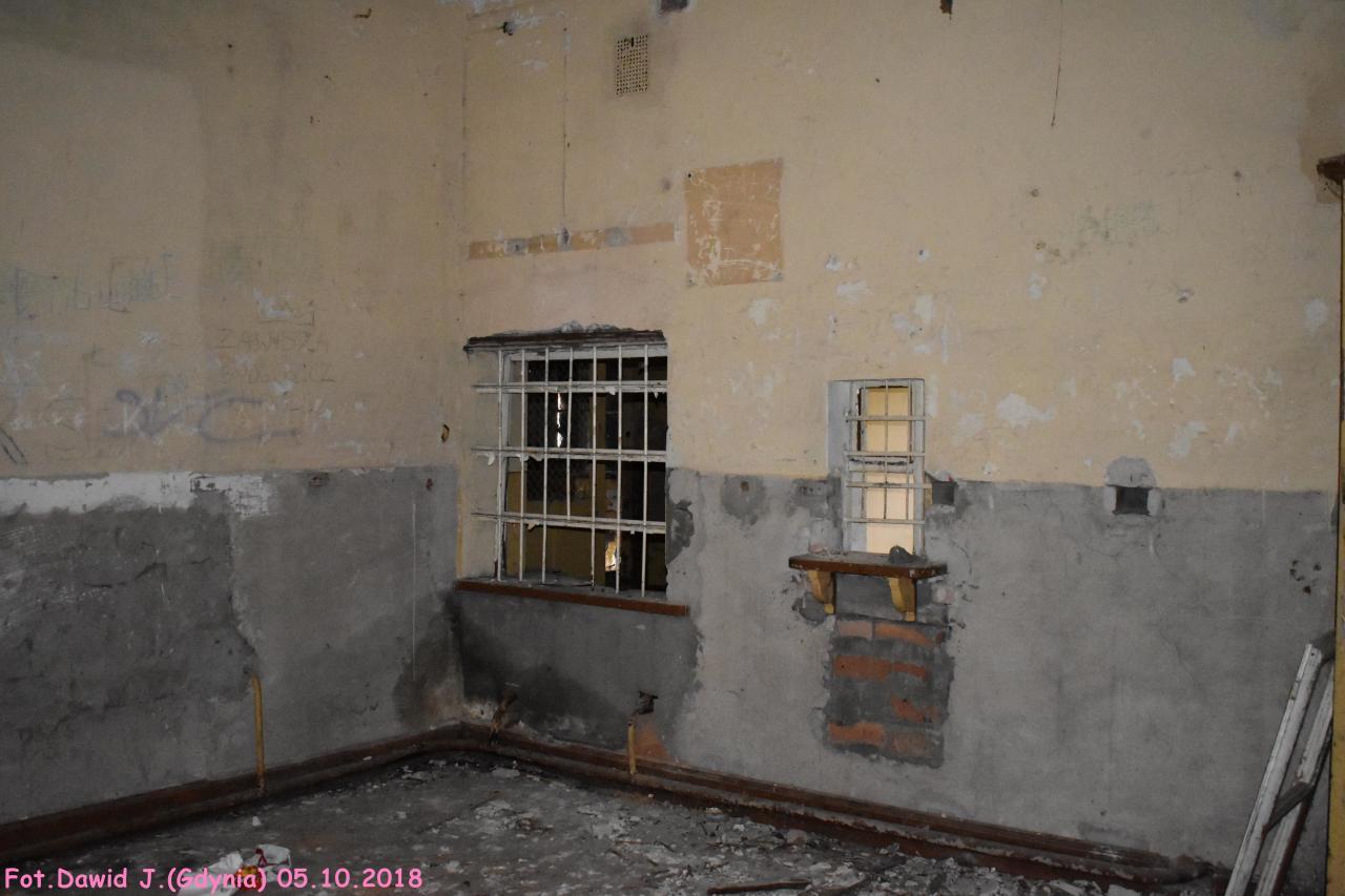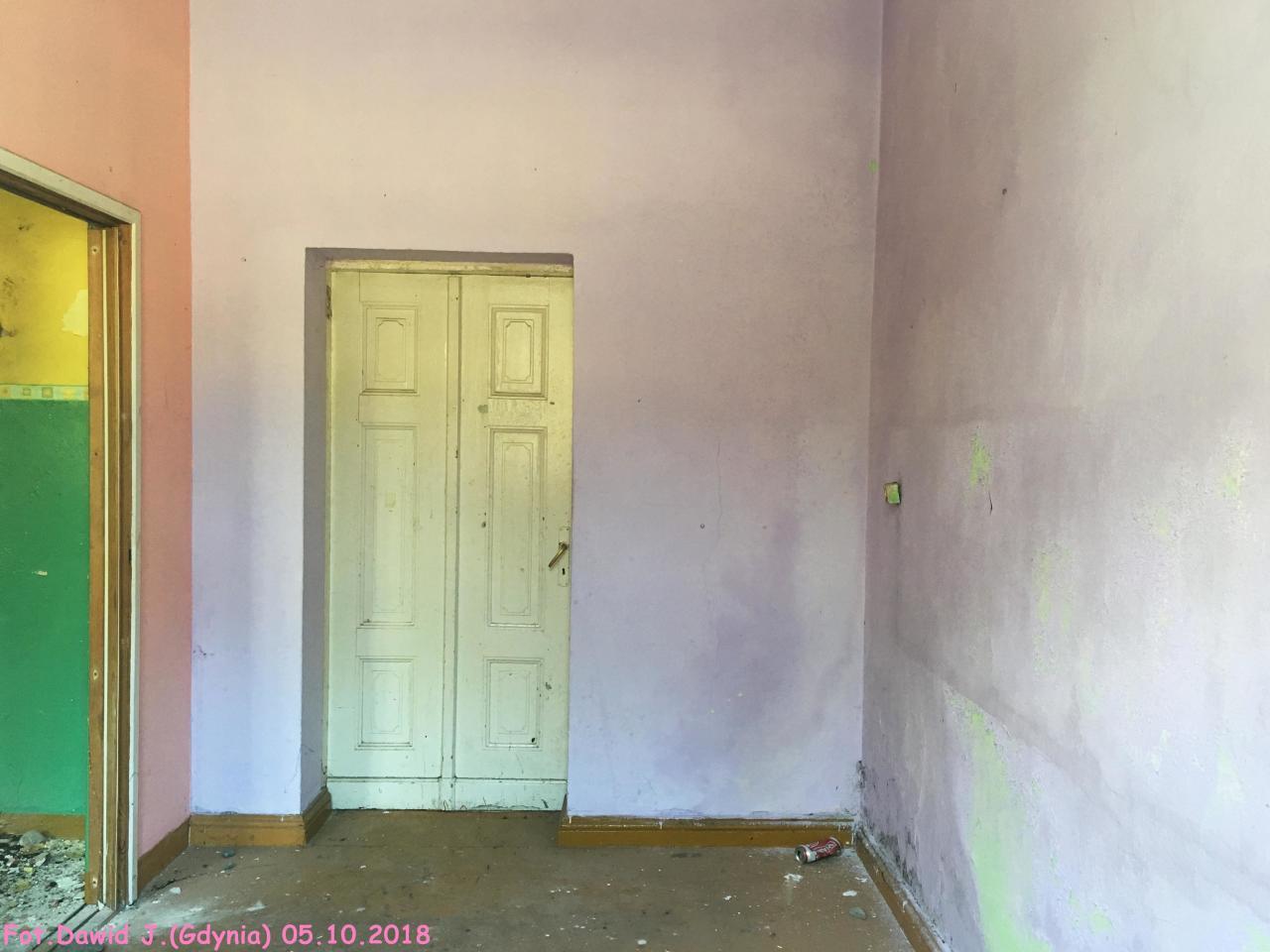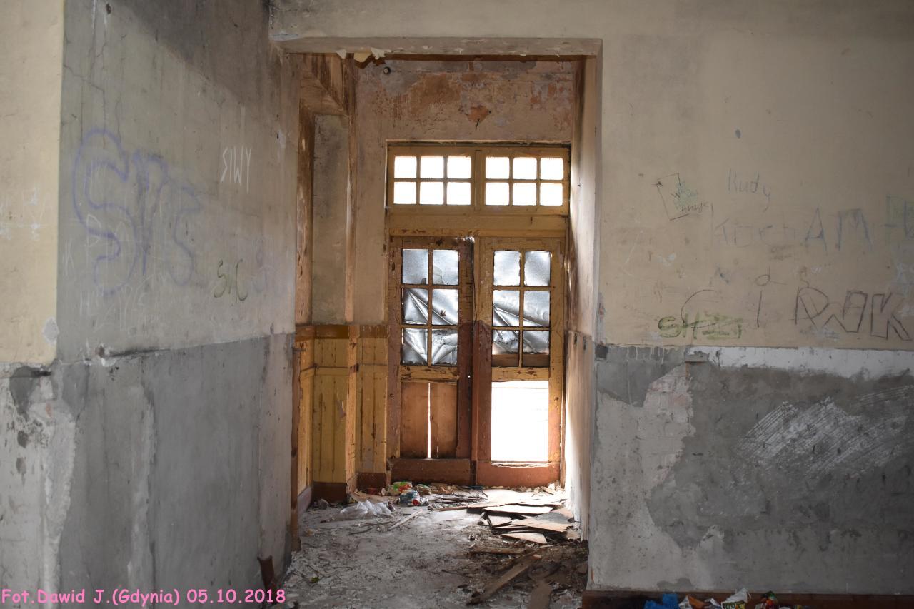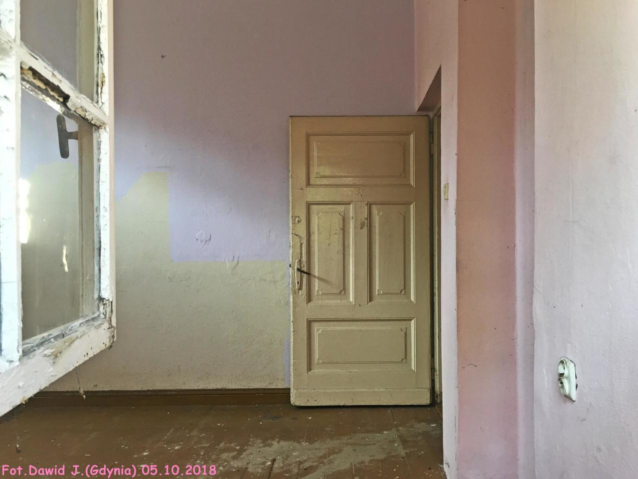 Wnętrze budynku dworcowego. Pomieszczenie w którym była kasa bagażowa i pomieszczenie dyżurnego ruchu.