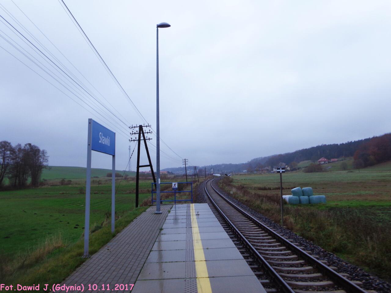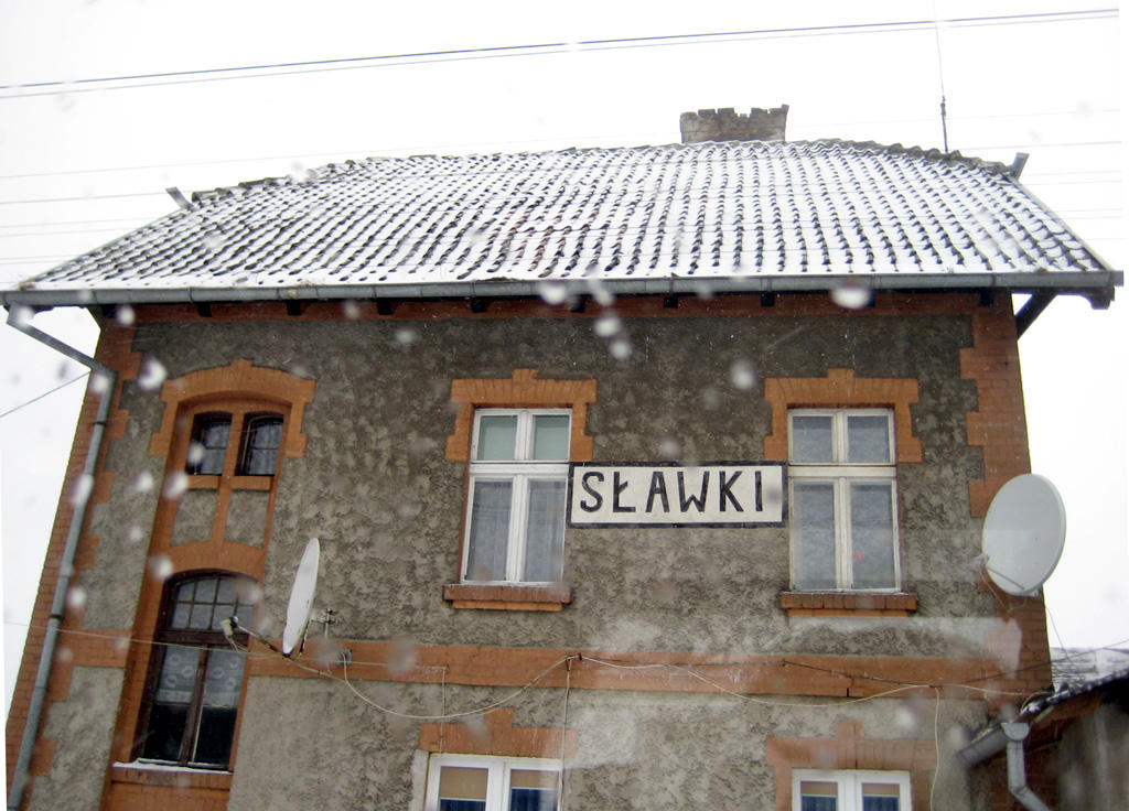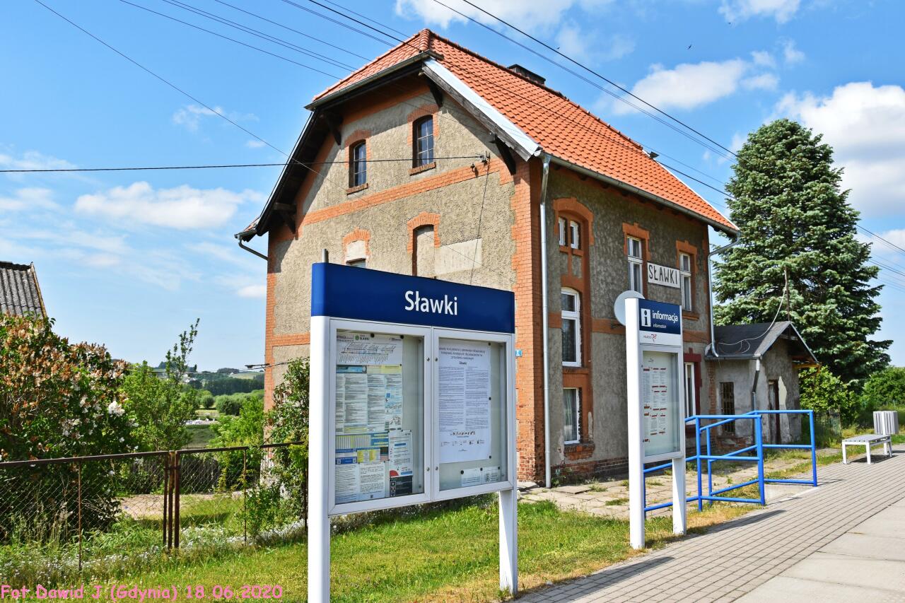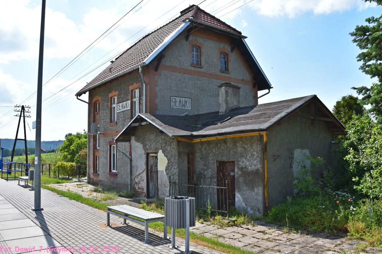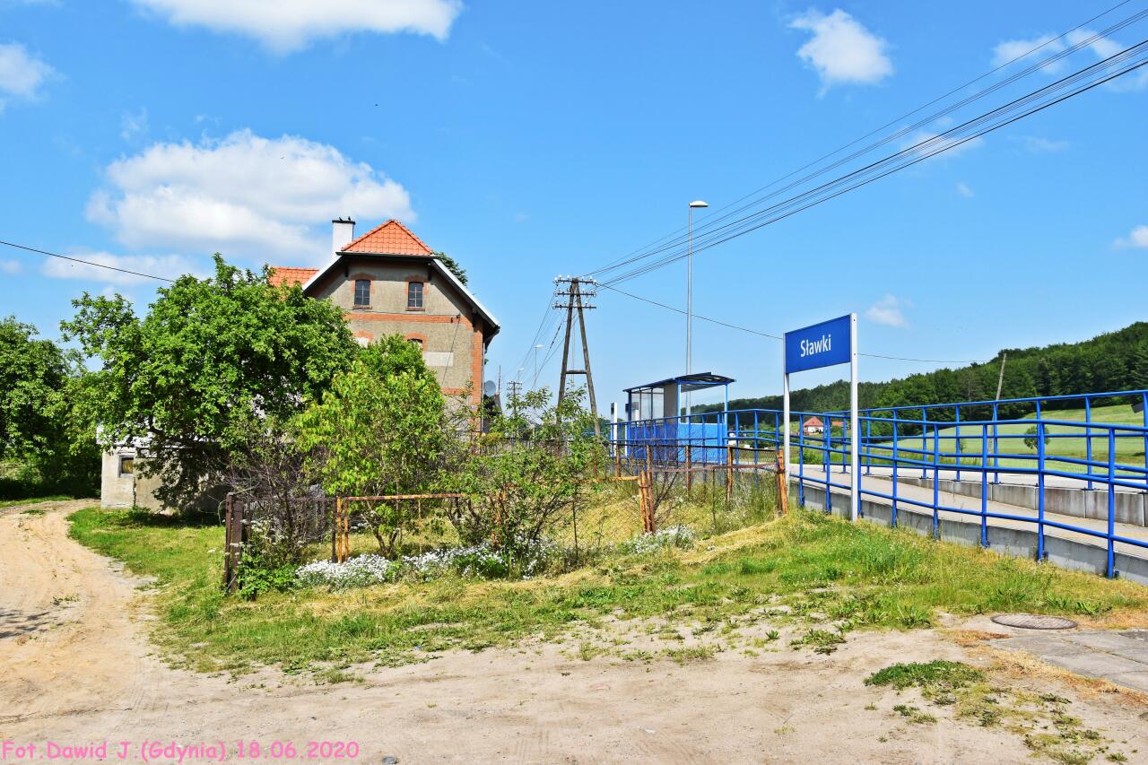 Przystanek PKP Sławki. Fragment kolejowego budynku mieszkalnego widziany z pociągu relacji Gdynia Główna - Kościerzyna: w lewo Kościerzyna, w prawo Somonino/Gdynia.