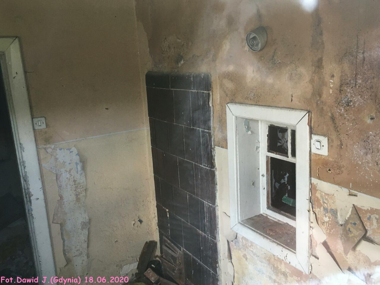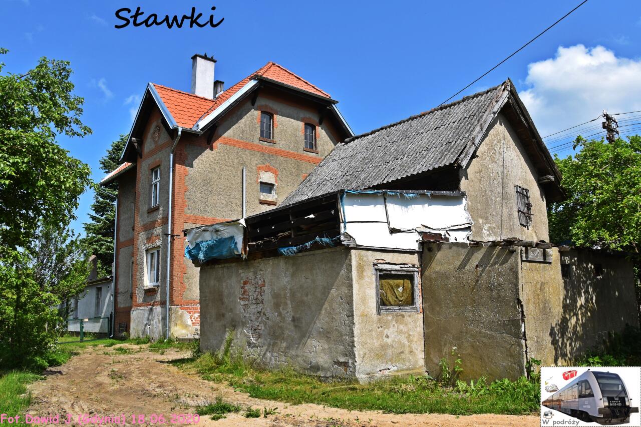 Kolejowy budynek mieszkalny z przyległym budynkiem dworcowym, widoczny od strony torów. Nieczynny punkt czerpania wody. Widok w kierunku Kościerzyny/Bydgoszczy Głównej.