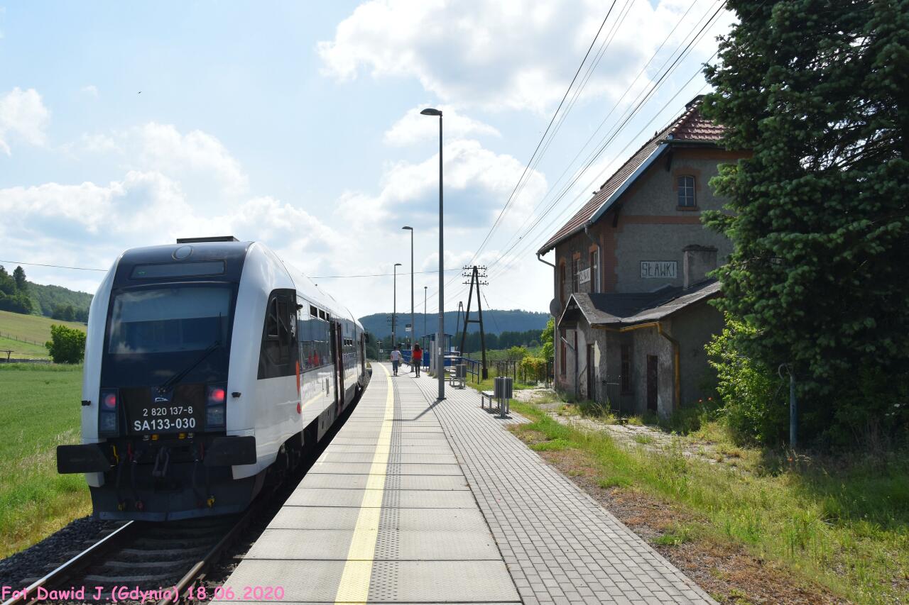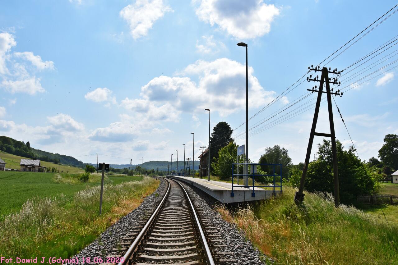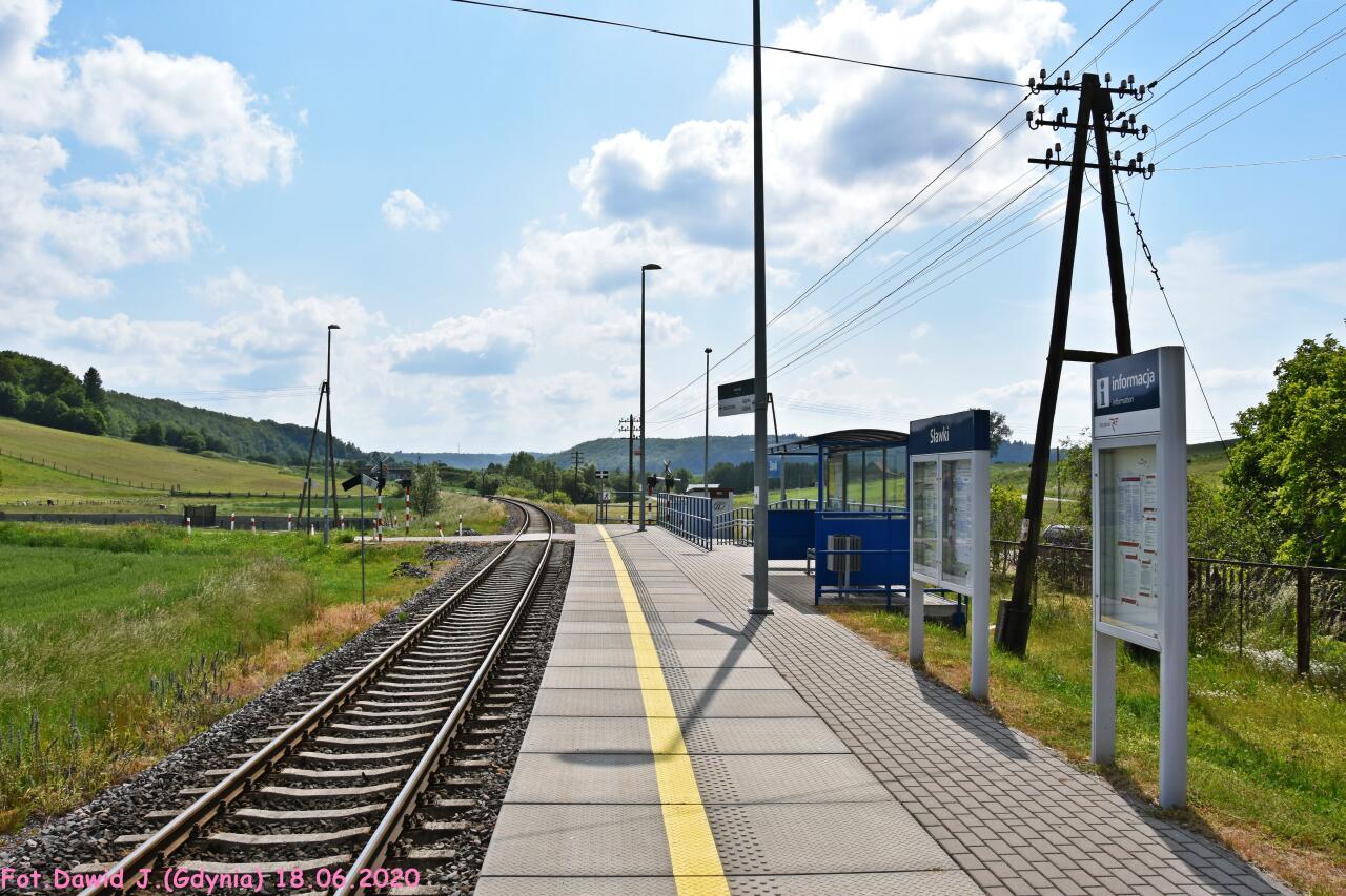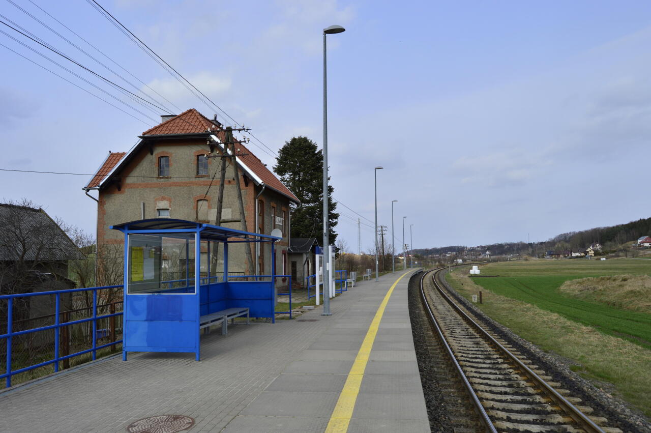 Widok z peronu w kierunku Kościerzyny/Bydgoszczy Głównej. Kolejowy budynek mieszkalny z przyległym budynkiem dworcowym, znajduje się po prawej stronie. Pociąg SA133-030 realizujący kurs PKP SKM relacji Gdynia Główna-Kościerzyna, oczekuje przy peronie.