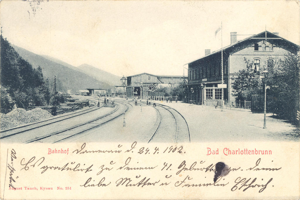 Pociąg szpitalny. Widok na stację w kierunku północno-zachodnim, od strony wjazdu z Głuszycy/Kłodzka. Na wprost, lekko z lewej budynek dworca.