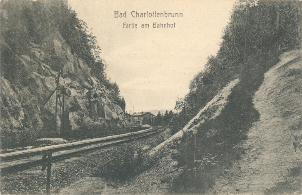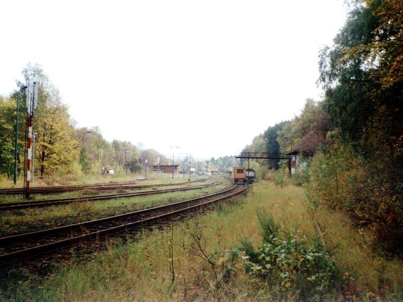 Widok na stację w kierunku północno-zachodnim, od strony wjazdu z Głuszycy/Kłodzka. Z prawej budynek dworca. Ze zbiorów Adama Pacześniaka.