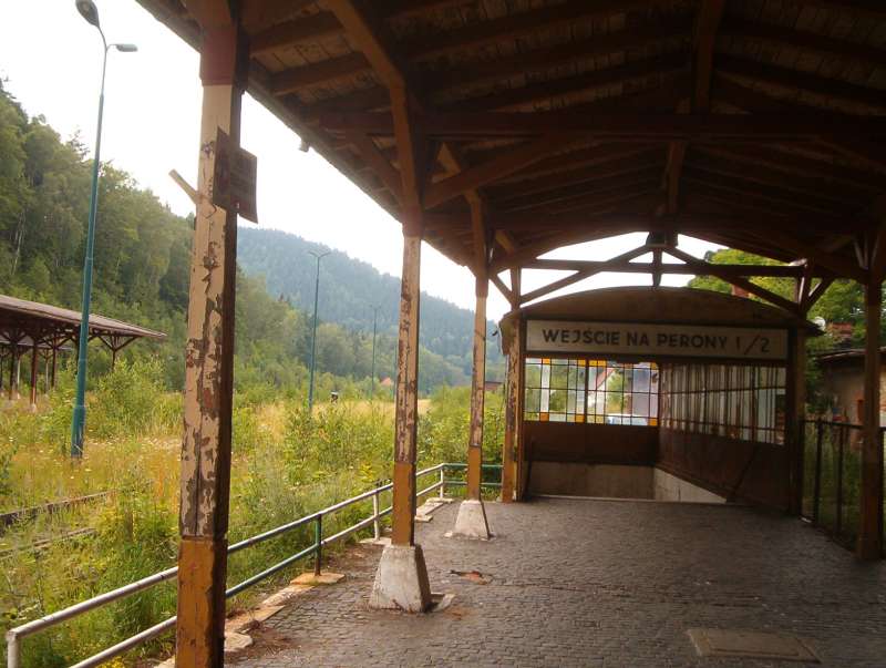 Widok na perony w kierunku północnym, od strony wjazdu z Głuszycy/Kłodzka. Przy peronie 1 zatrzymał się skład do Kłodzka. Ostatnie chwile funkcjonowania stacji. Z prawej budynek dworca. Ze zbiorów Adama Pacześniaka.